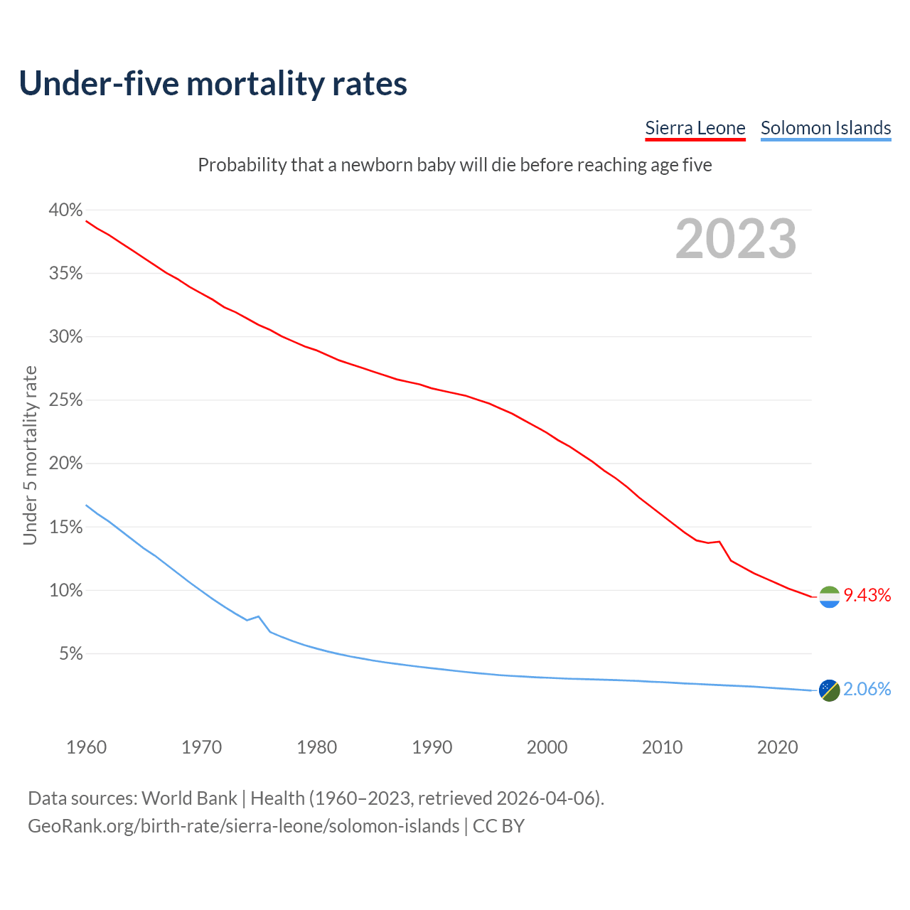 The chance that a newborn baby will die before reaching age five is 9.43% in Sierra Leone and 2.06% in the Solomon Islands. Above is a chart with historical data on under-five mortality rates.
