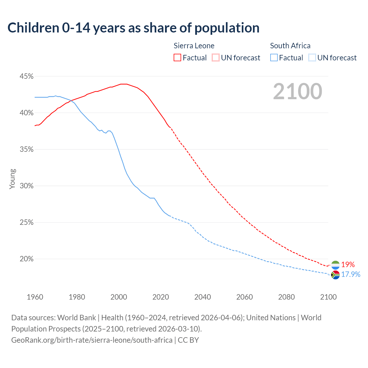 According to the latest available data on birth rates, the fertility rate in Sierra Leone was 3.79 children per woman in 2023, compared to 2.22 in South Africa in 2023. The replacement level is considered to be 2.1 children per woman.