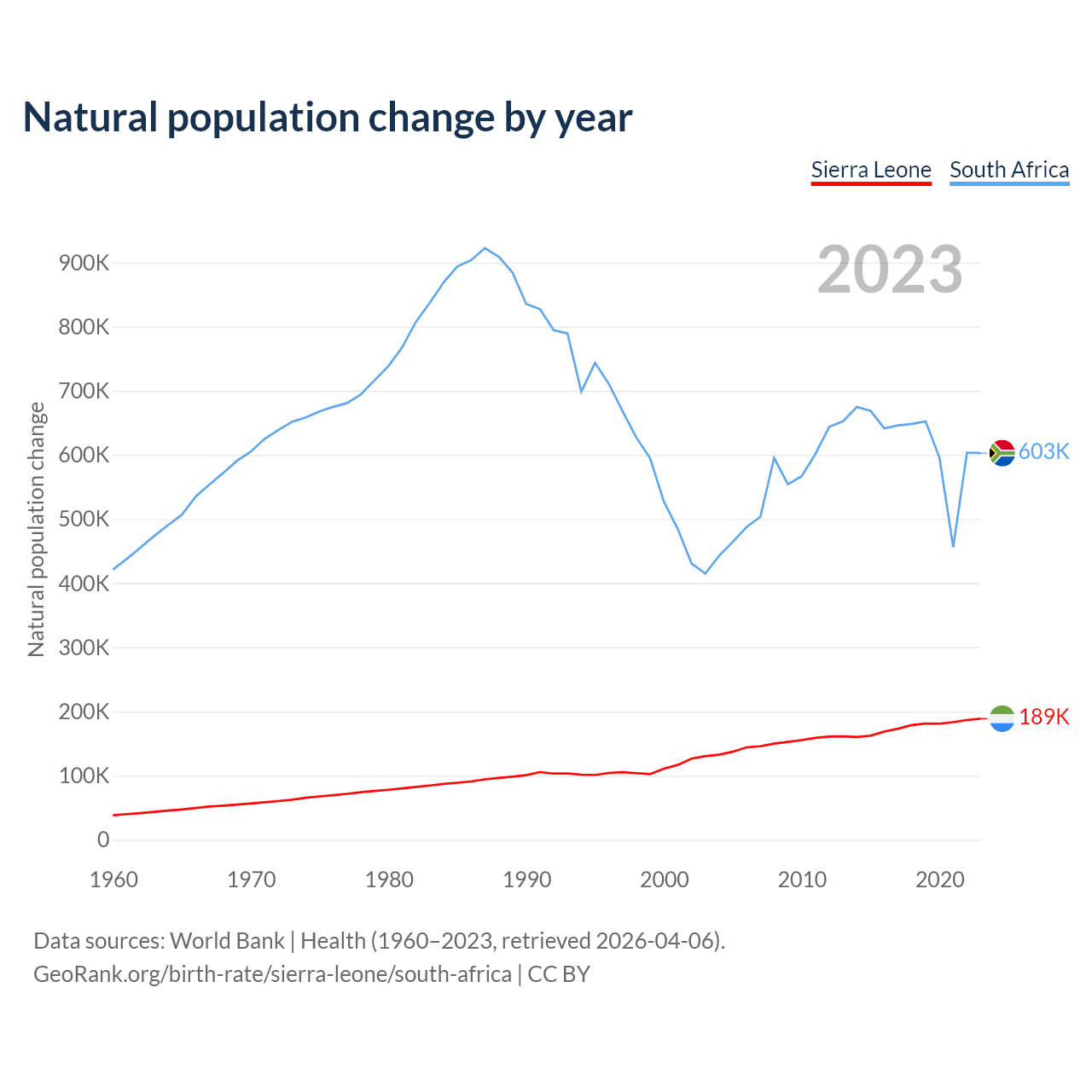 Sierra Leone has an annual birth rate of 30.6 births per 1,000 people, compared to 18.8 for South Africa. The average number of children a woman is expected to have during her lifetime — the fertility rate, is 3.79 in Sierra Leone and 2.22 in South Africa — 41.5% difference.