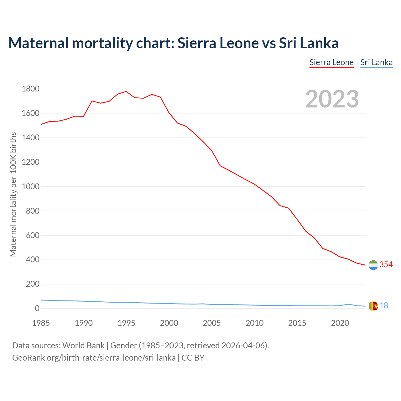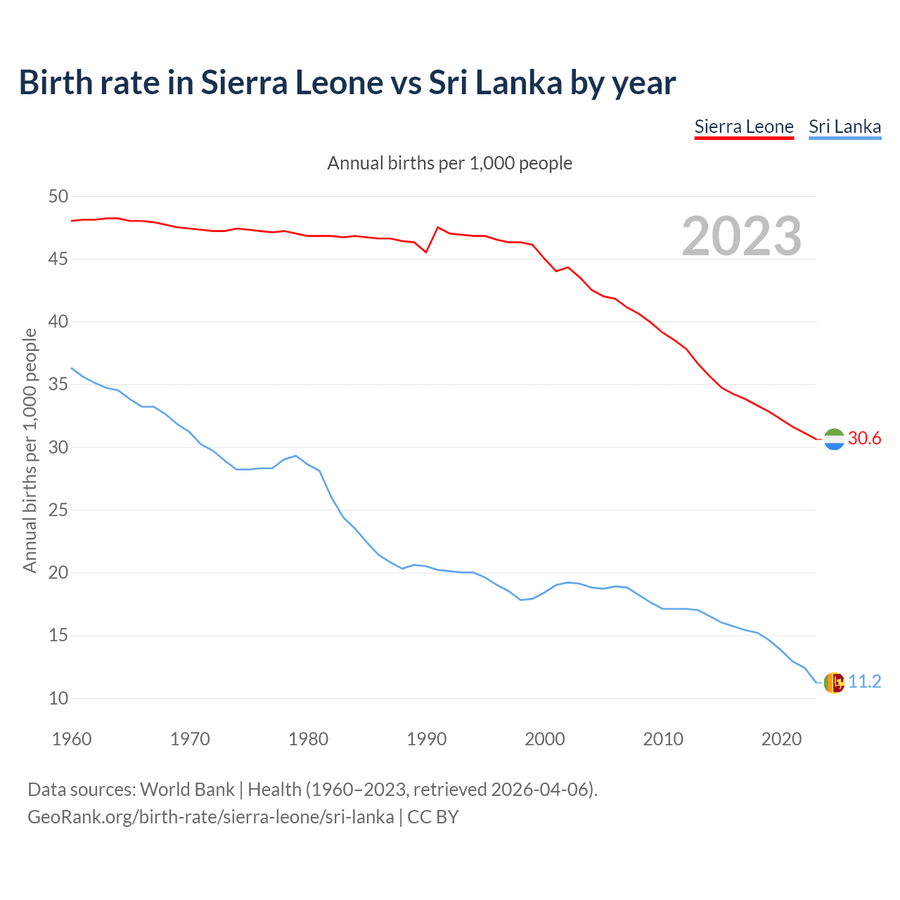 Sierra Leone has an annual birth rate of 30.6 births per 1,000 people, compared to 11.2 for Sri Lanka. The average number of children a woman is expected to have during her lifetime — the fertility rate, is 3.79 in Sierra Leone and 1.97 in Sri Lanka — 47.9% difference.
