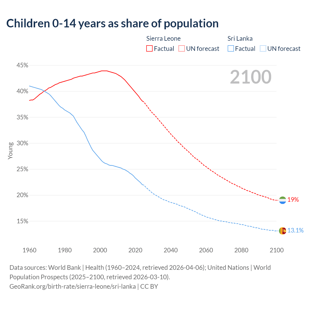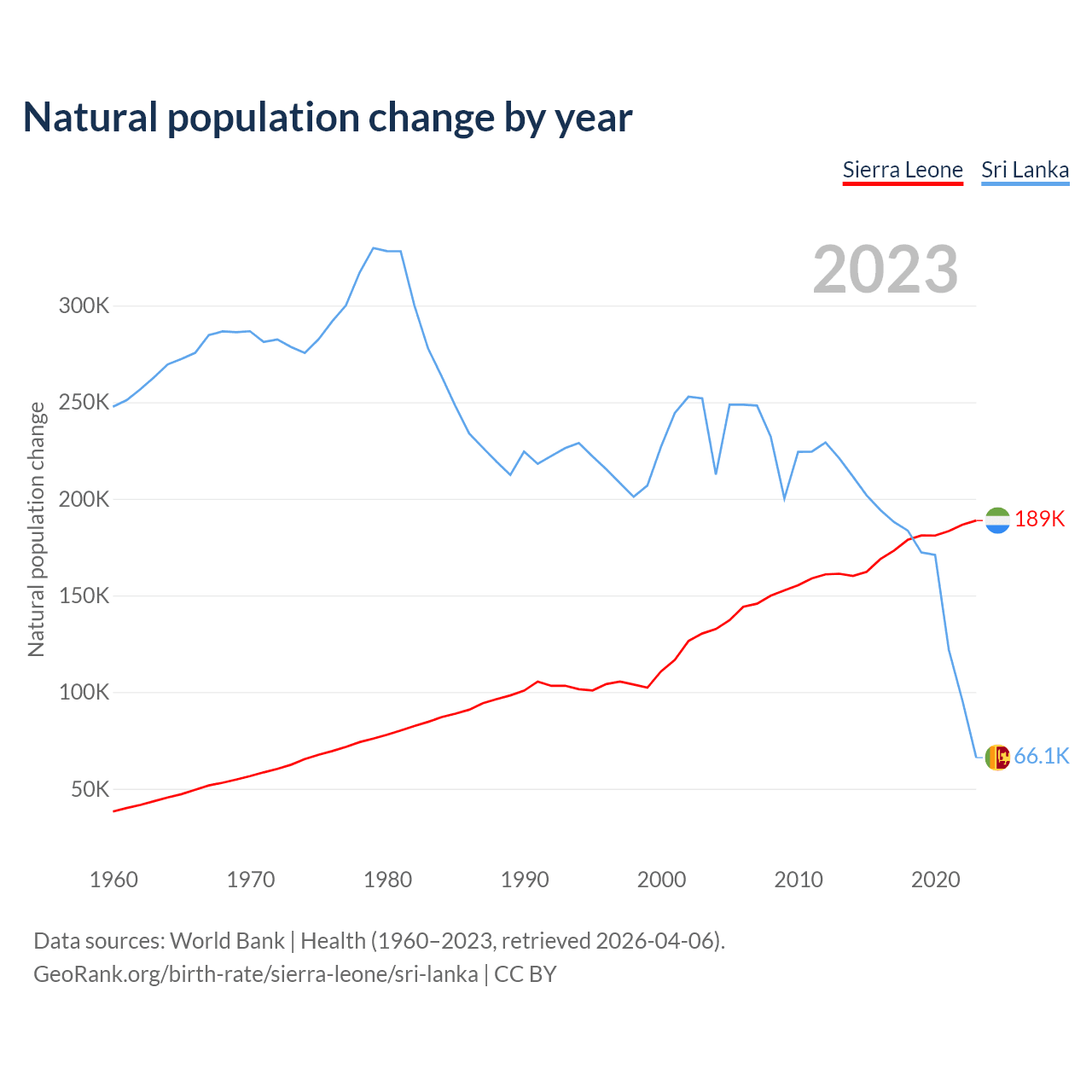 According to the latest available data on birth rates, the fertility rate in Sierra Leone was 3.79 children per woman in 2023, compared to 1.97 in Sri Lanka in 2023. The replacement level is considered to be 2.1 children per woman.