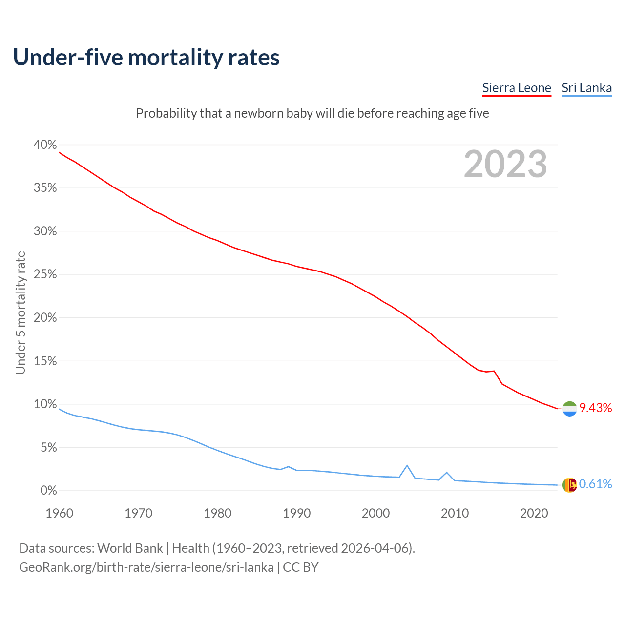The chance that a newborn baby will die before reaching age five is 9.43% in Sierra Leone and 0.61% in Sri Lanka. Above is a chart with historical data on under-five mortality rates.
