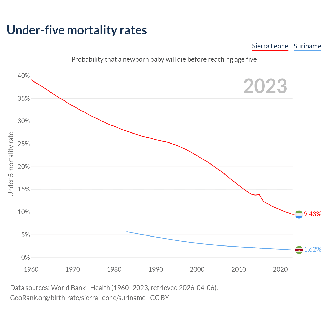 The chance that a newborn baby will die before reaching age five is 9.43% in Sierra Leone and 1.62% in Suriname. Above is a chart with historical data on under-five mortality rates.