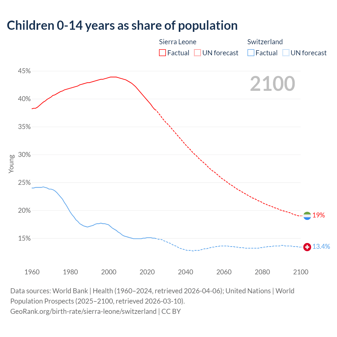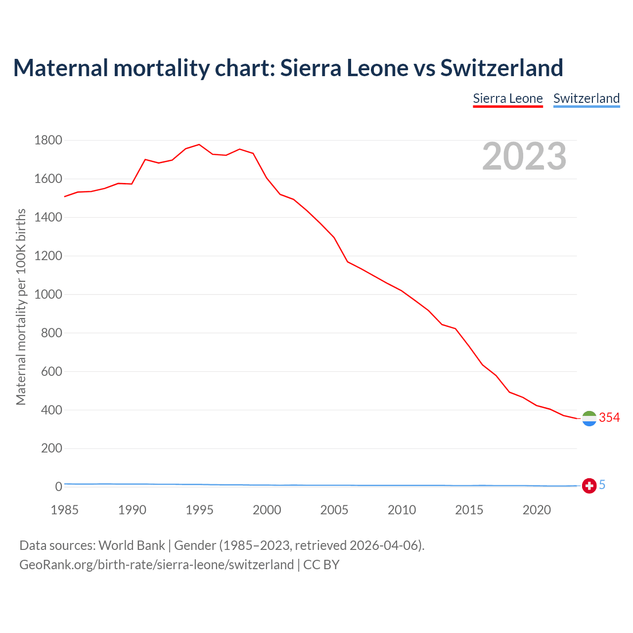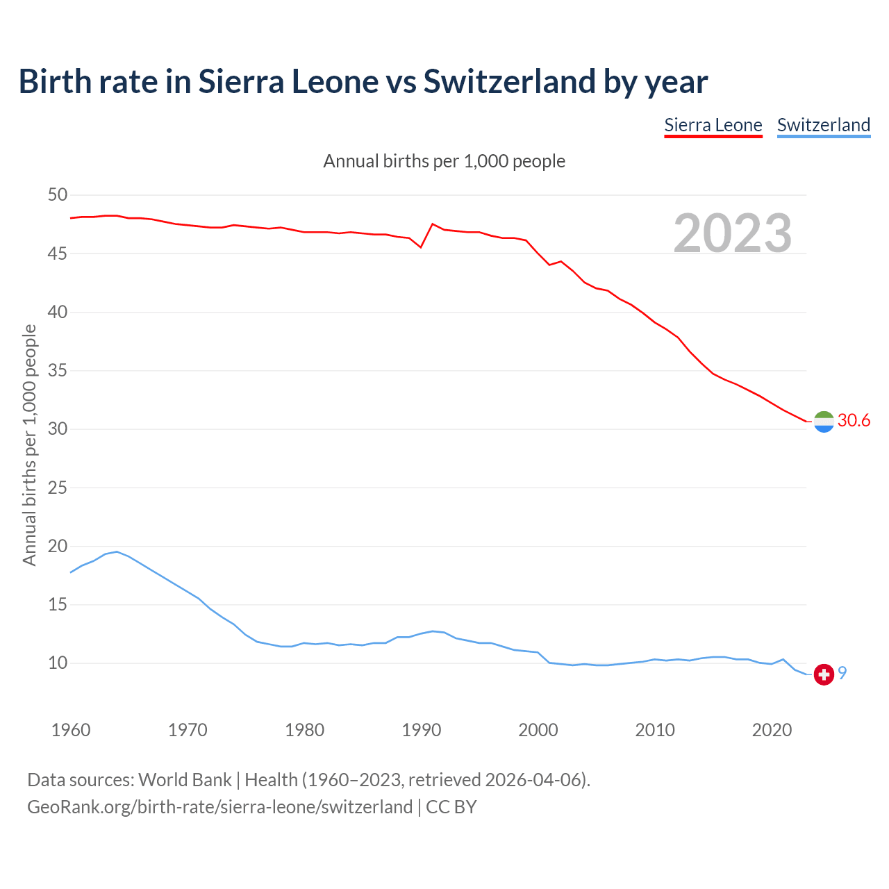 Sierra Leone has an annual birth rate of 30.6 births per 1,000 people, compared to 9 for Switzerland. The average number of children a woman is expected to have during her lifetime — the fertility rate, is 3.79 in Sierra Leone and 1.33 in Switzerland — 64.9% difference.