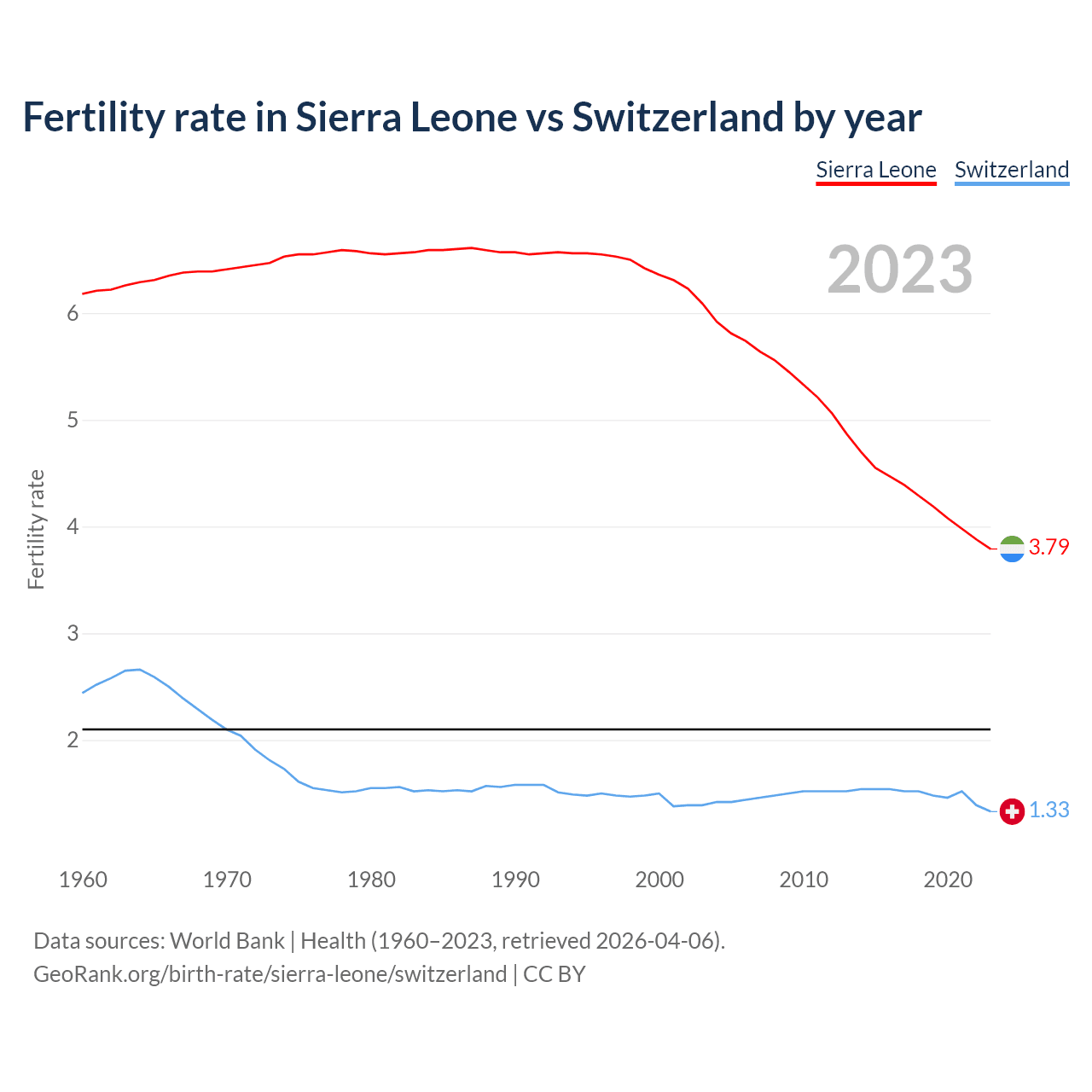 According to the latest available data on birth rates, the fertility rate in Sierra Leone was 3.79 children per woman in 2023, compared to 1.33 in Switzerland in 2023. The replacement level is considered to be 2.1 children per woman.