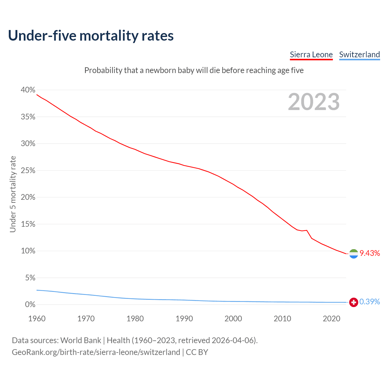The chance that a newborn baby will die before reaching age five is 9.43% in Sierra Leone and 0.39% in Switzerland. Above is a chart with historical data on under-five mortality rates.