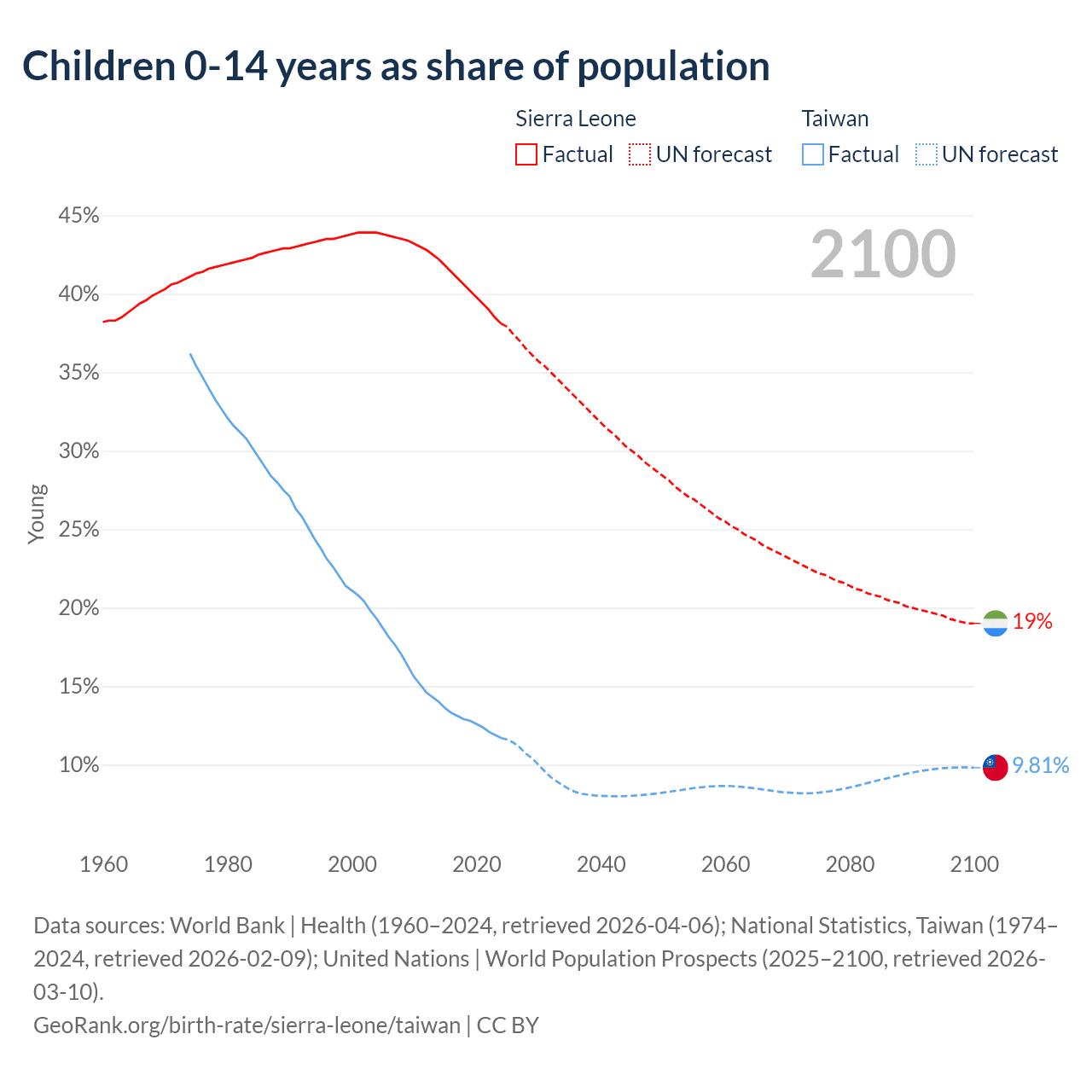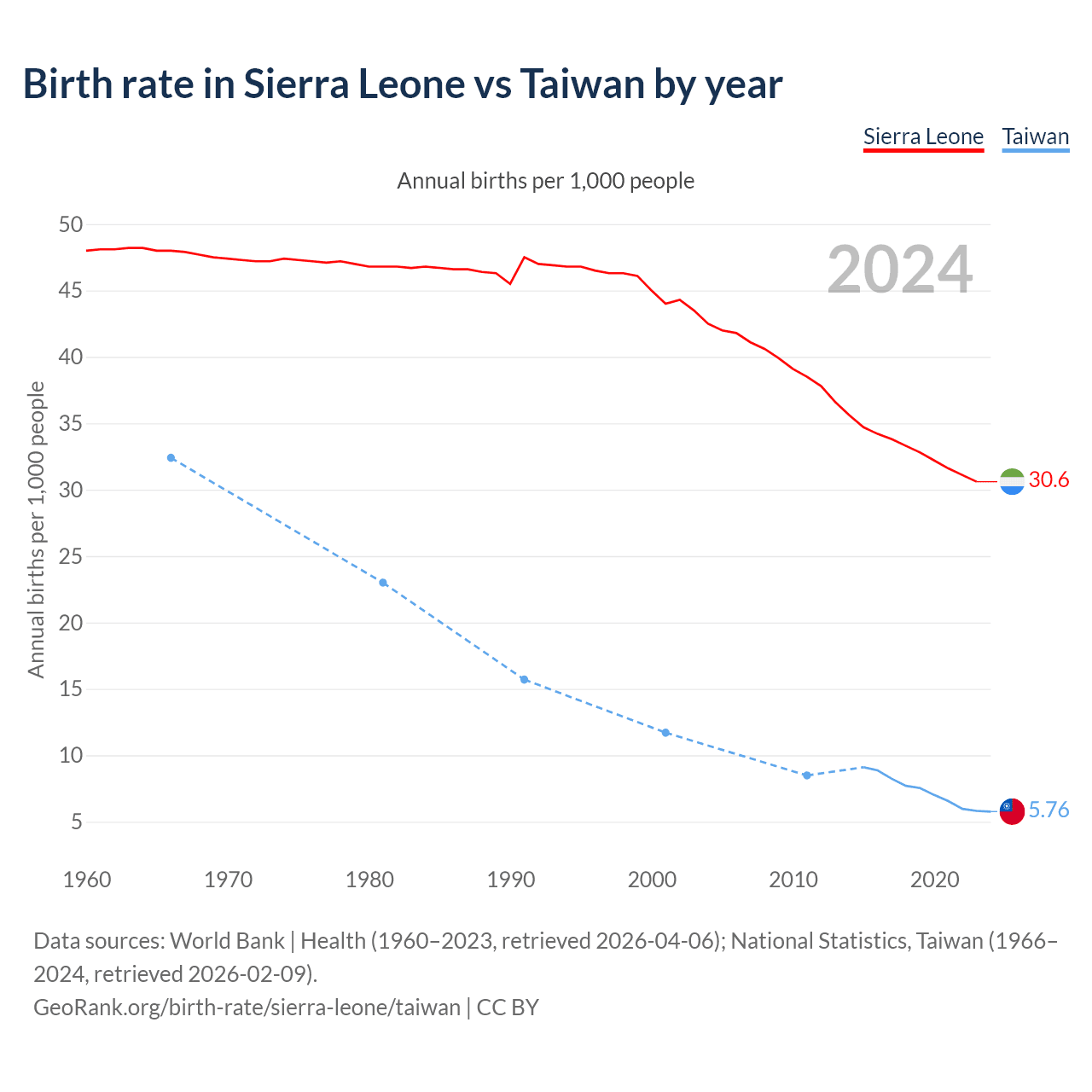 Sierra Leone has an annual birth rate of 30.6 births per 1,000 people, compared to 5.76 for Taiwan. The average number of children a woman is expected to have during her lifetime — the fertility rate, is 3.79 in Sierra Leone and 0.89 in Taiwan — 76.7% difference.