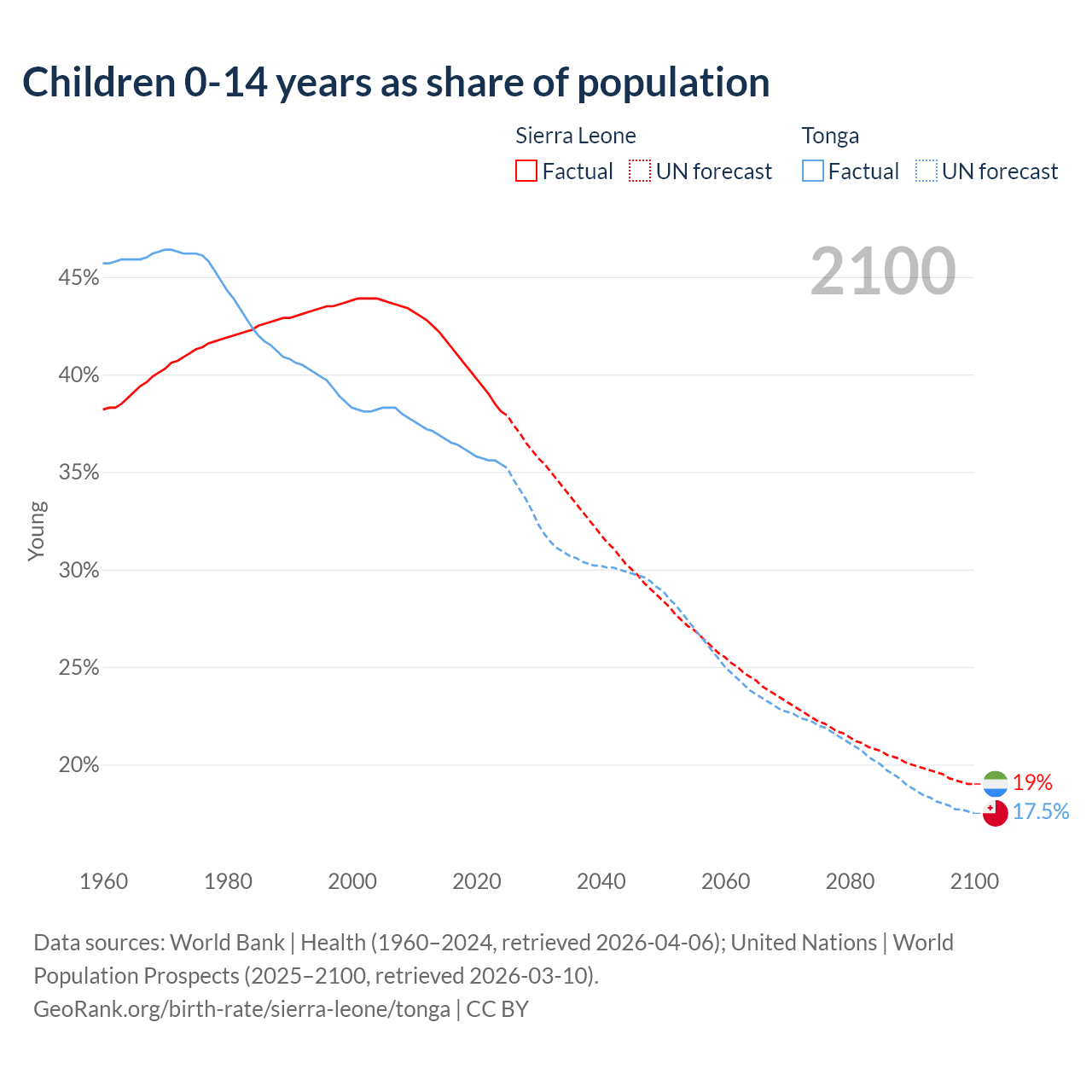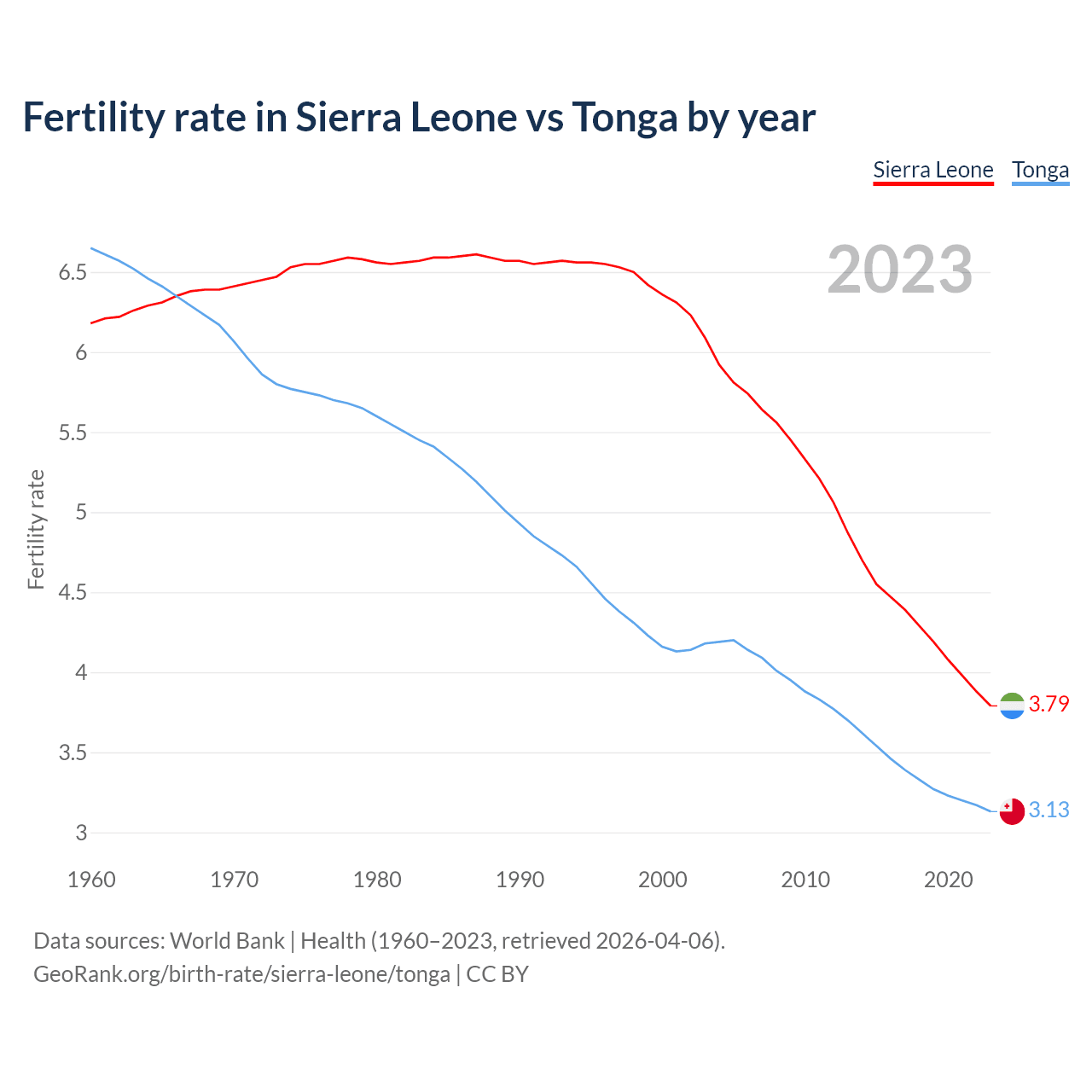 According to the latest available data on birth rates, the fertility rate in Sierra Leone was 3.79 children per woman in 2023, compared to 3.13 in Tonga in 2023. The replacement level is considered to be 2.1 children per woman.