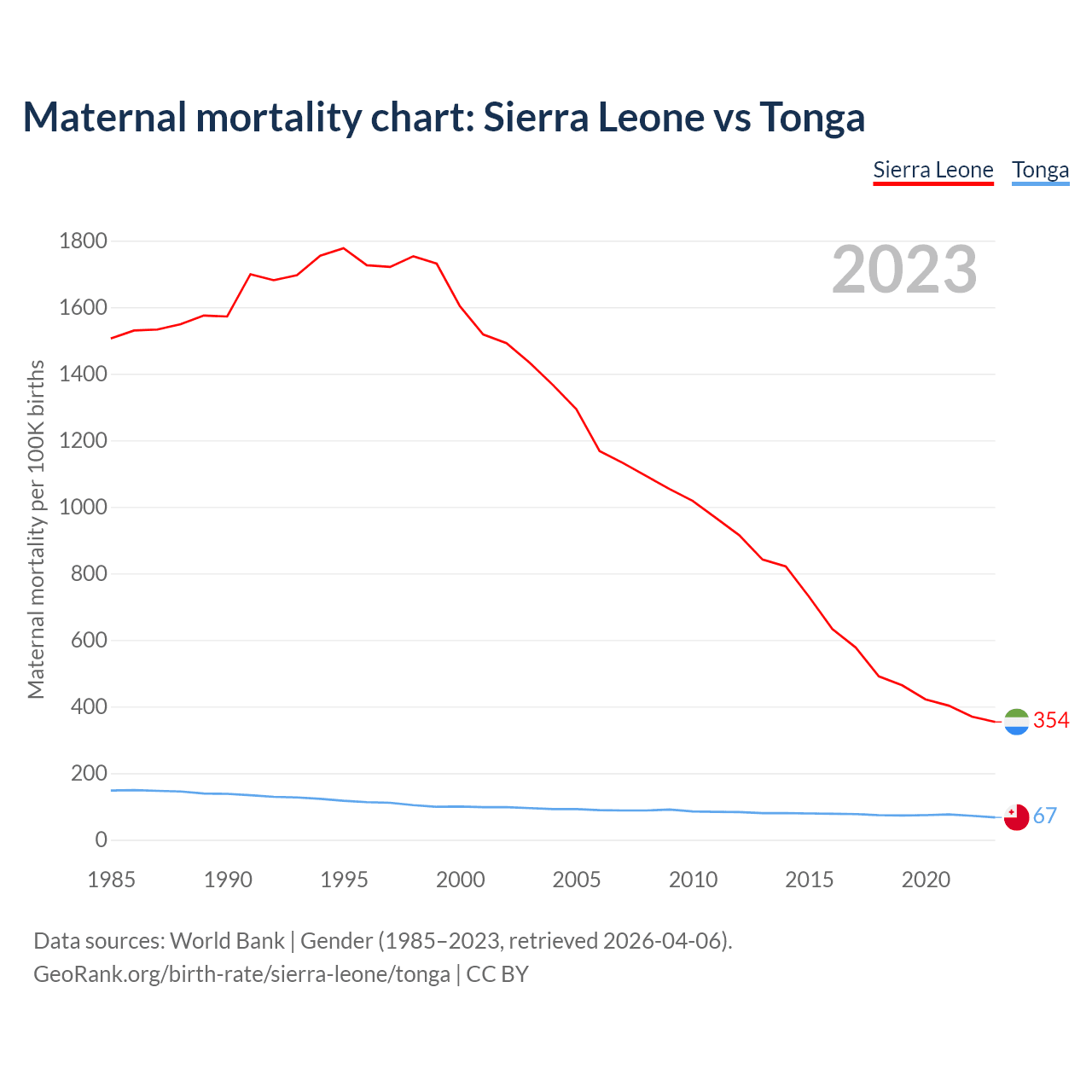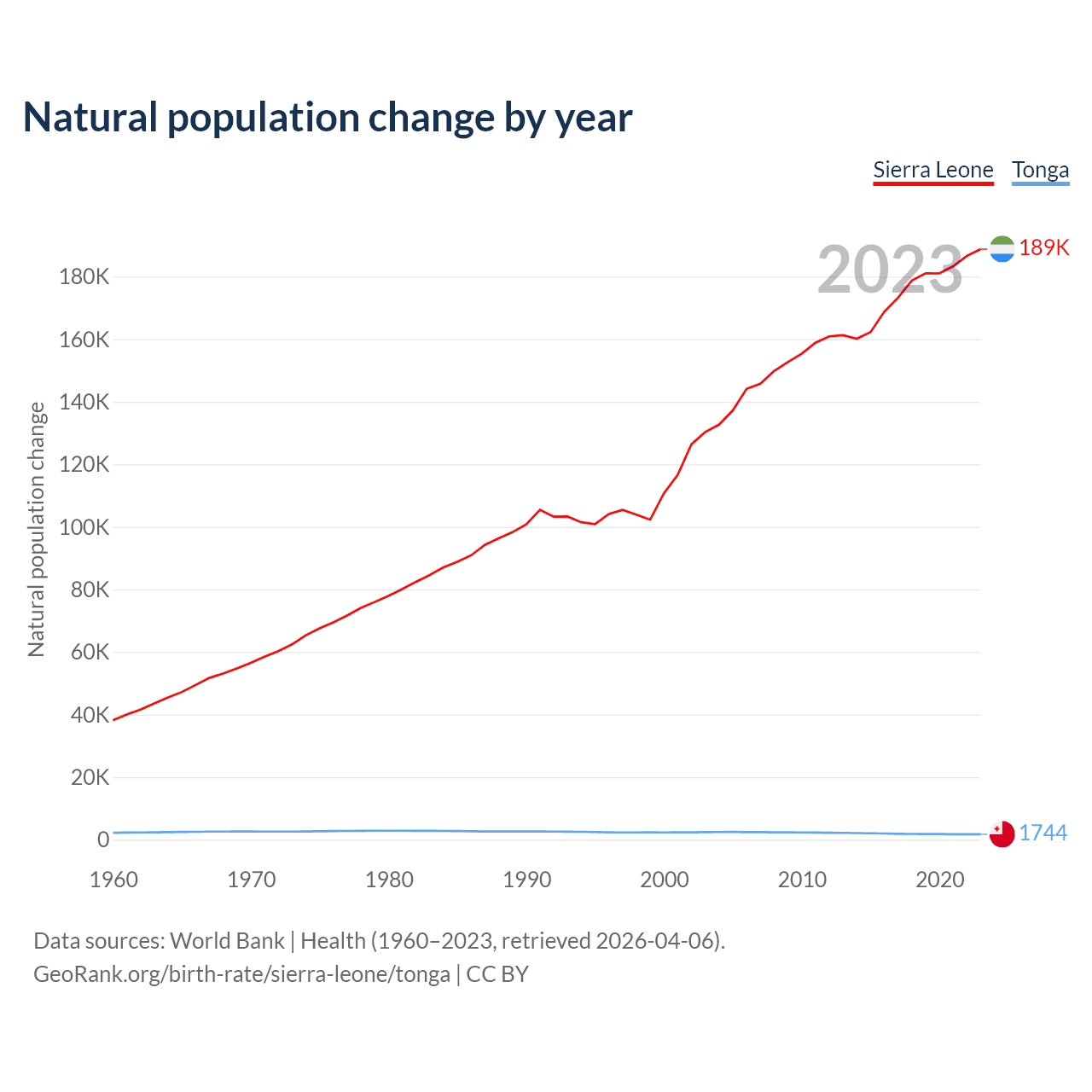 Sierra Leone has an annual birth rate of 30.6 births per 1,000 people, compared to 23.1 for Tonga. The average number of children a woman is expected to have during her lifetime — the fertility rate, is 3.79 in Sierra Leone and 3.13 in Tonga — 17.5% difference.