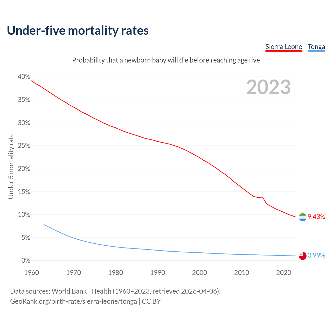 The chance that a newborn baby will die before reaching age five is 9.43% in Sierra Leone and 0.99% in Tonga. Above is a chart with historical data on under-five mortality rates.
