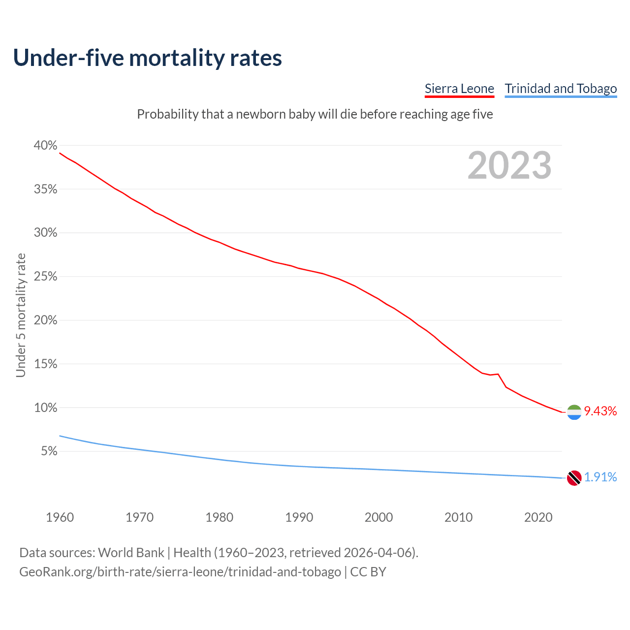 The chance that a newborn baby will die before reaching age five is 9.43% in Sierra Leone and 1.91% in Trinidad and Tobago. Above is a chart with historical data on under-five mortality rates.