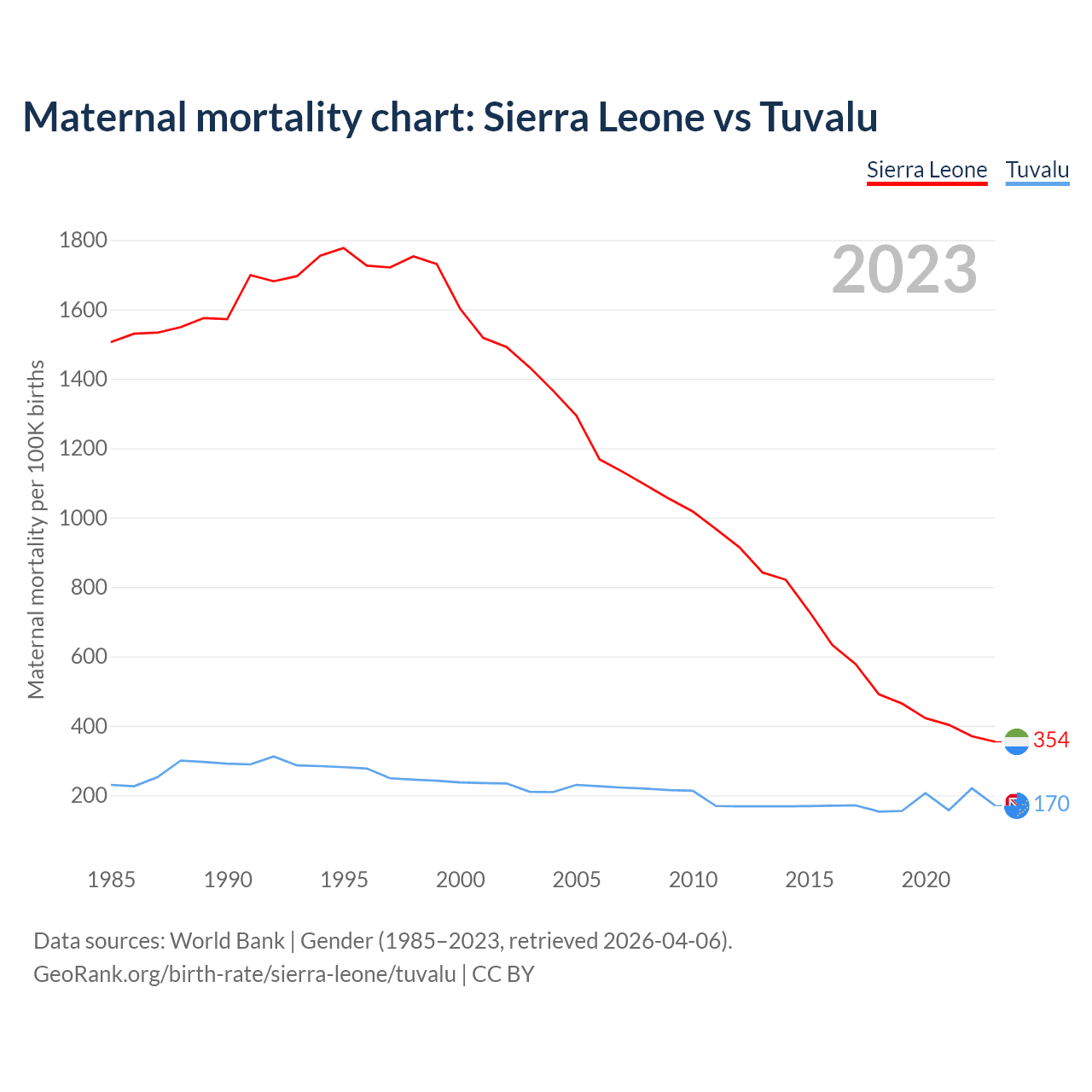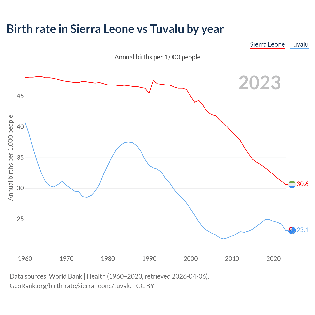 Sierra Leone has an annual birth rate of 30.6 births per 1,000 people, compared to 23.1 for Tuvalu. The average number of children a woman is expected to have during her lifetime — the fertility rate, is 3.79 in Sierra Leone and 3.21 in Tuvalu — 15.4% difference.