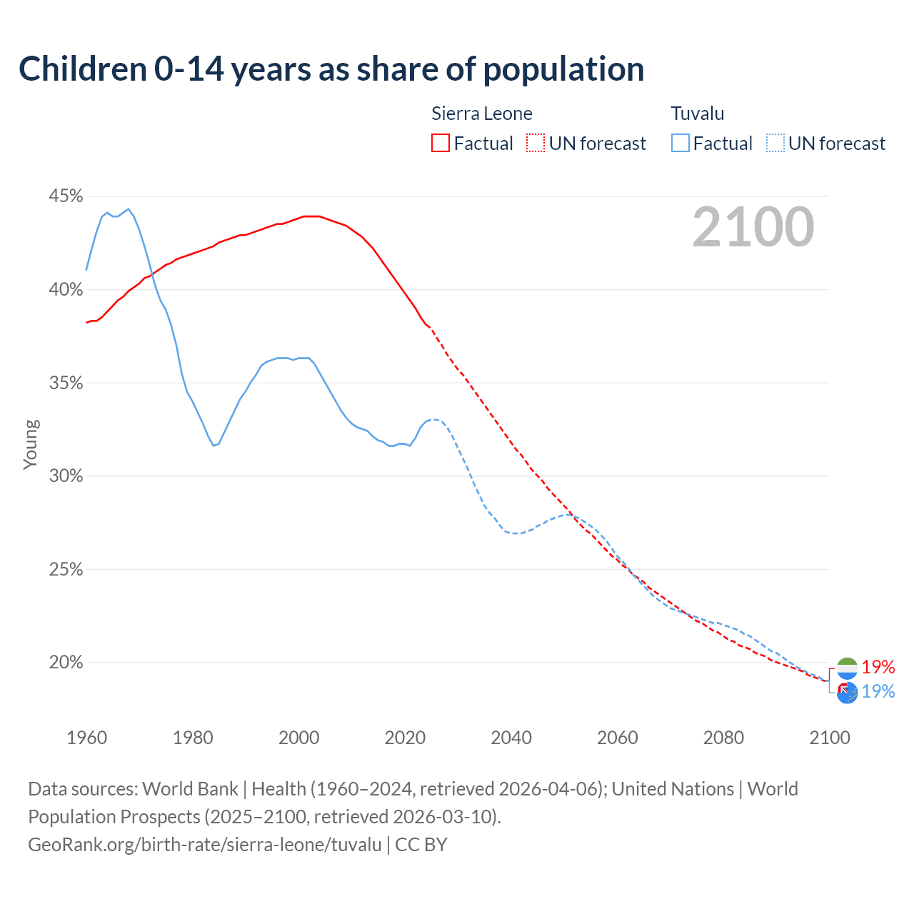 According to the latest available data on birth rates, the fertility rate in Sierra Leone was 3.79 children per woman in 2023, compared to 3.21 in Tuvalu in 2023. The replacement level is considered to be 2.1 children per woman.
