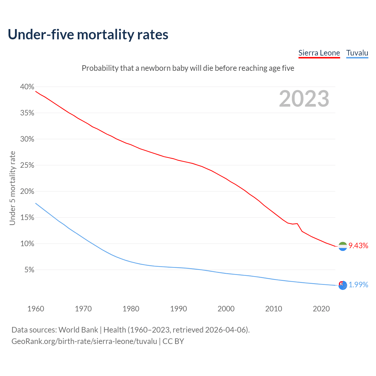 The chance that a newborn baby will die before reaching age five is 9.43% in Sierra Leone and 1.99% in Tuvalu. Above is a chart with historical data on under-five mortality rates.