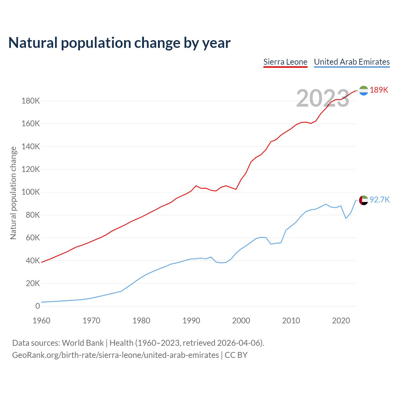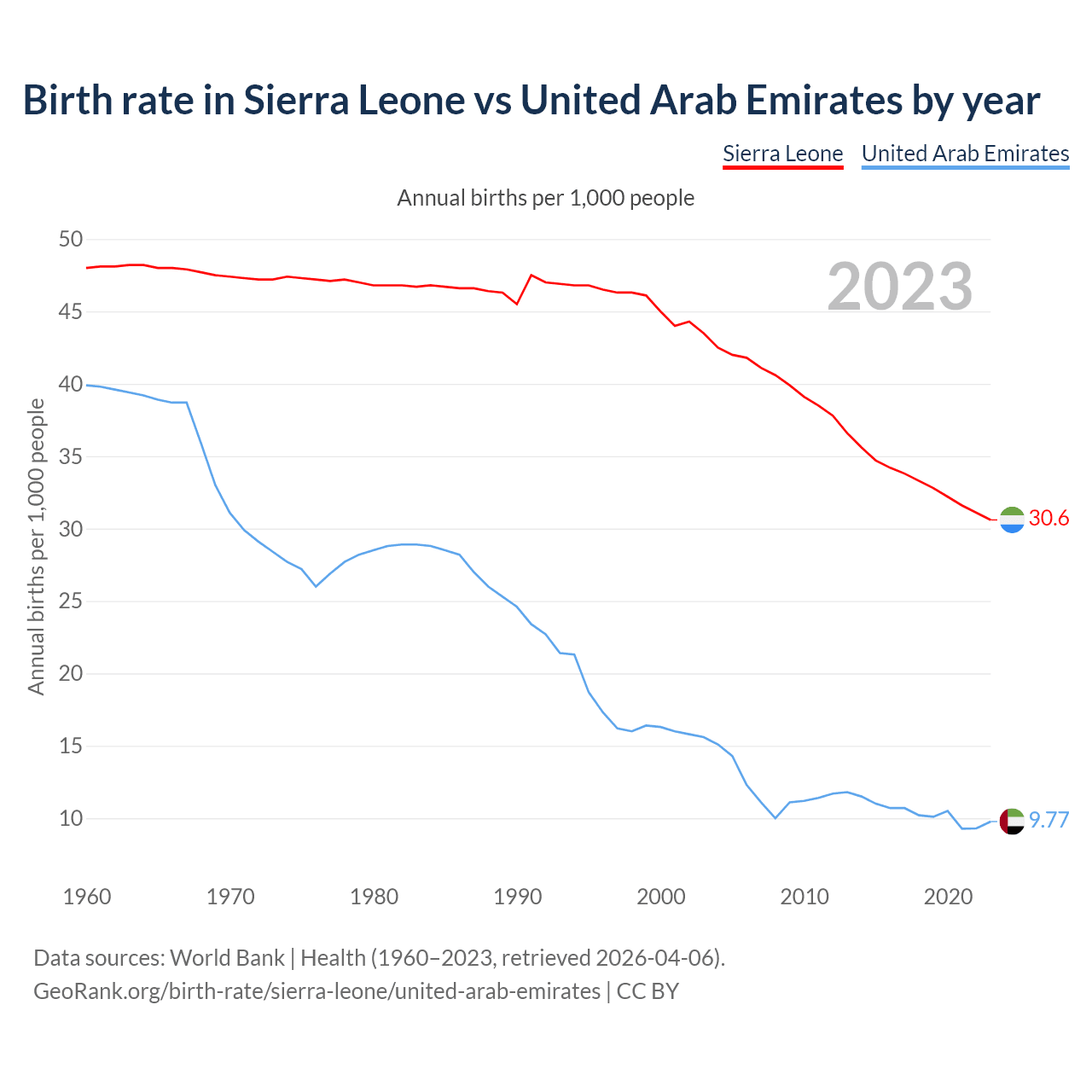 Sierra Leone has an annual birth rate of 30.6 births per 1,000 people, compared to 9.77 for the United Arab Emirates. The average number of children a woman is expected to have during her lifetime — the fertility rate, is 3.79 in Sierra Leone and 1.2 in the United Arab Emirates — 68.3% difference.