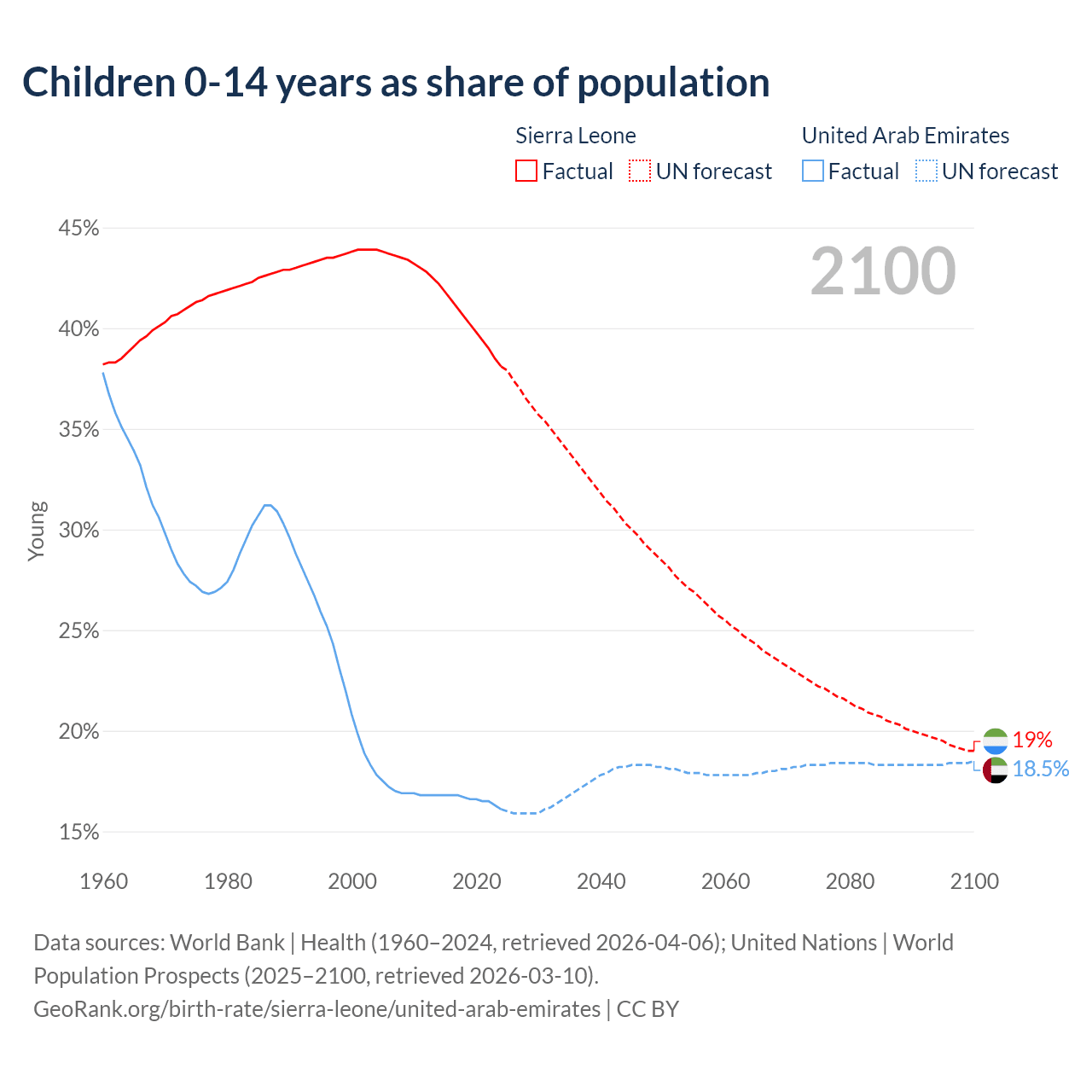 According to the latest available data on birth rates, the fertility rate in Sierra Leone was 3.79 children per woman in 2023, compared to 1.2 in the United Arab Emirates in 2023. The replacement level is considered to be 2.1 children per woman.