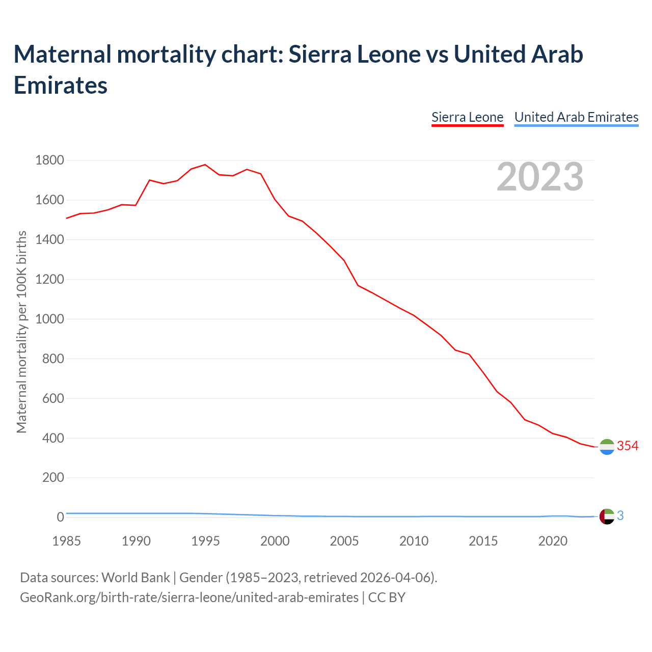 The maternal mortality rate, which is the probability of dying during childbirth or within 42 days of pregnancy termination, is 354 deaths per 100,000 live births in Sierra Leone, compared to 3 deaths in the United Arab Emirates.