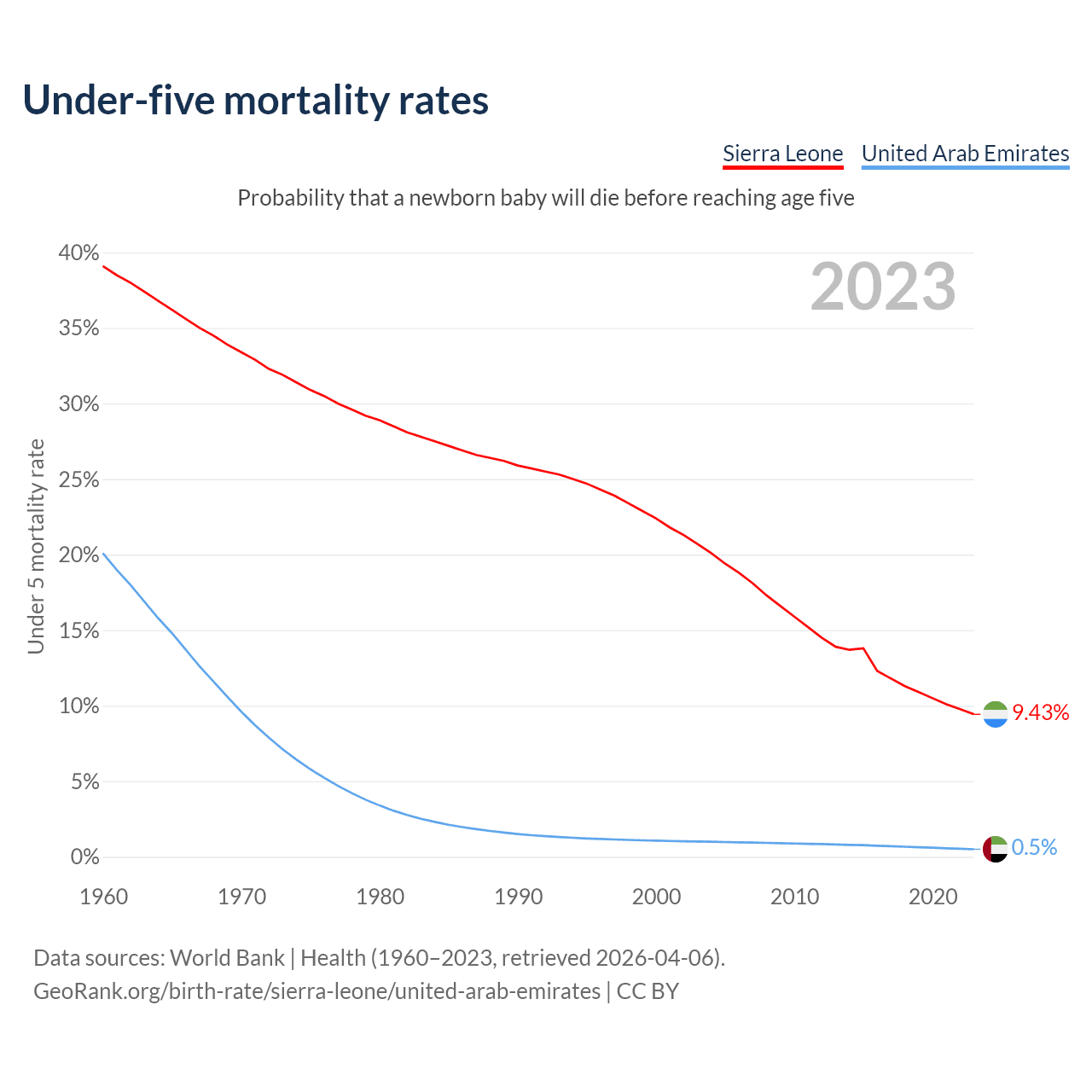 The chance that a newborn baby will die before reaching age five is 9.43% in Sierra Leone and 0.5% in the United Arab Emirates. Above is a chart with historical data on under-five mortality rates.