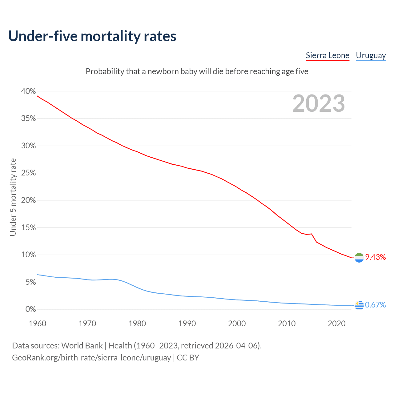 The chance that a newborn baby will die before reaching age five is 9.43% in Sierra Leone and 0.67% in Uruguay. Above is a chart with historical data on under-five mortality rates.