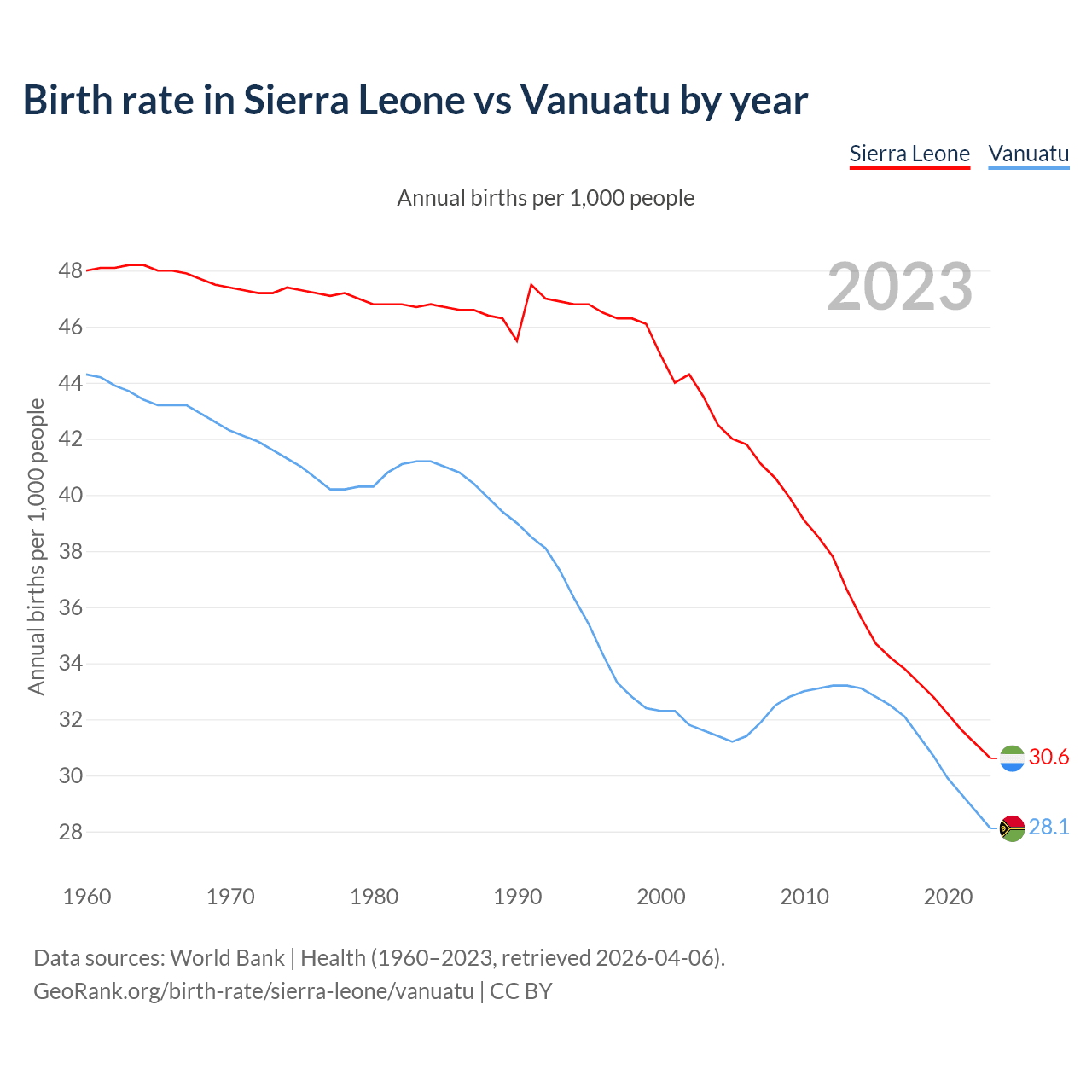Sierra Leone has an annual birth rate of 30.6 births per 1,000 people, compared to 28.1 for Vanuatu. The average number of children a woman is expected to have during her lifetime — the fertility rate, is 3.79 in Sierra Leone and 3.6 in Vanuatu — 5.14% difference.