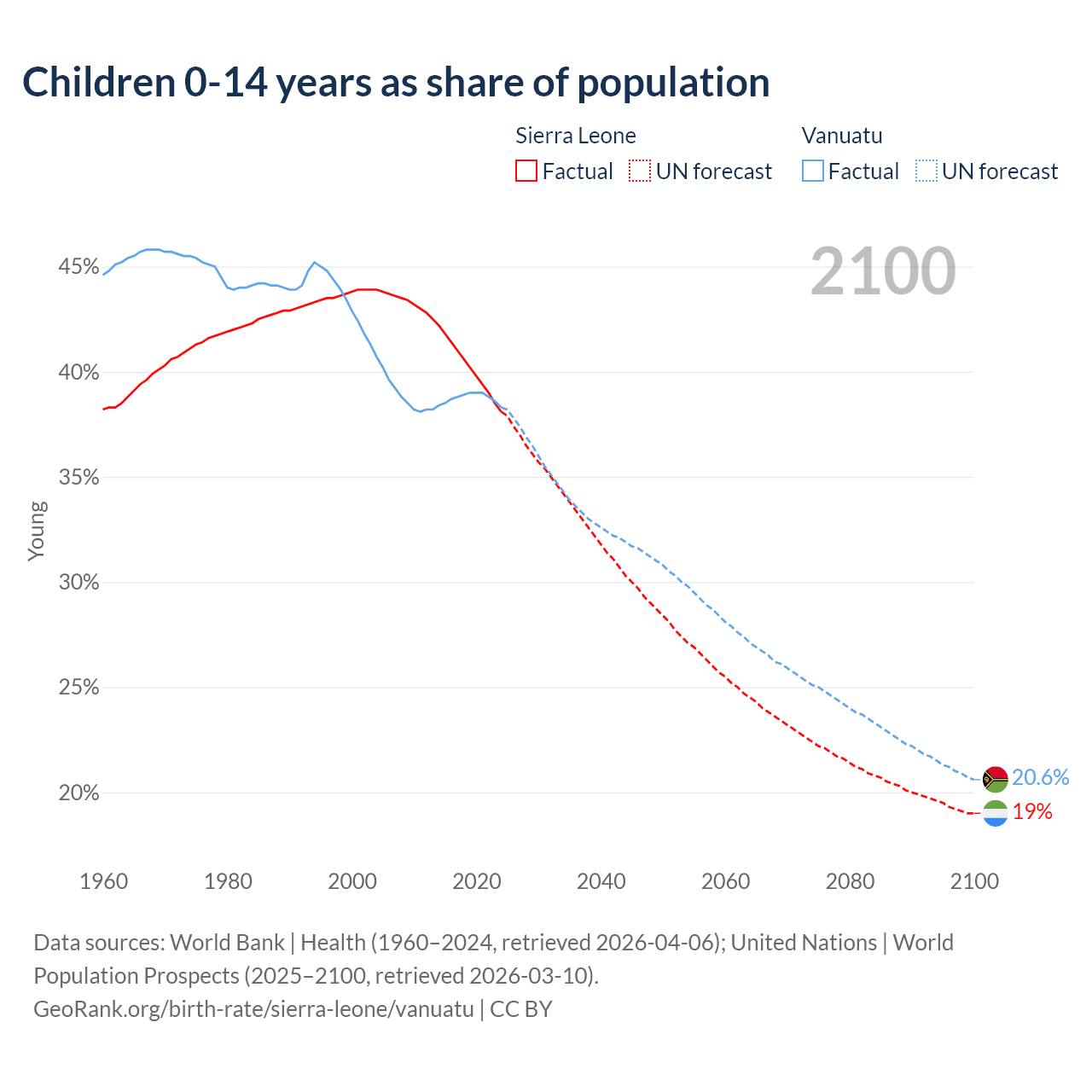 According to the latest available data on birth rates, the fertility rate in Sierra Leone was 3.79 children per woman in 2023, compared to 3.6 in Vanuatu in 2023. The replacement level is considered to be 2.1 children per woman.