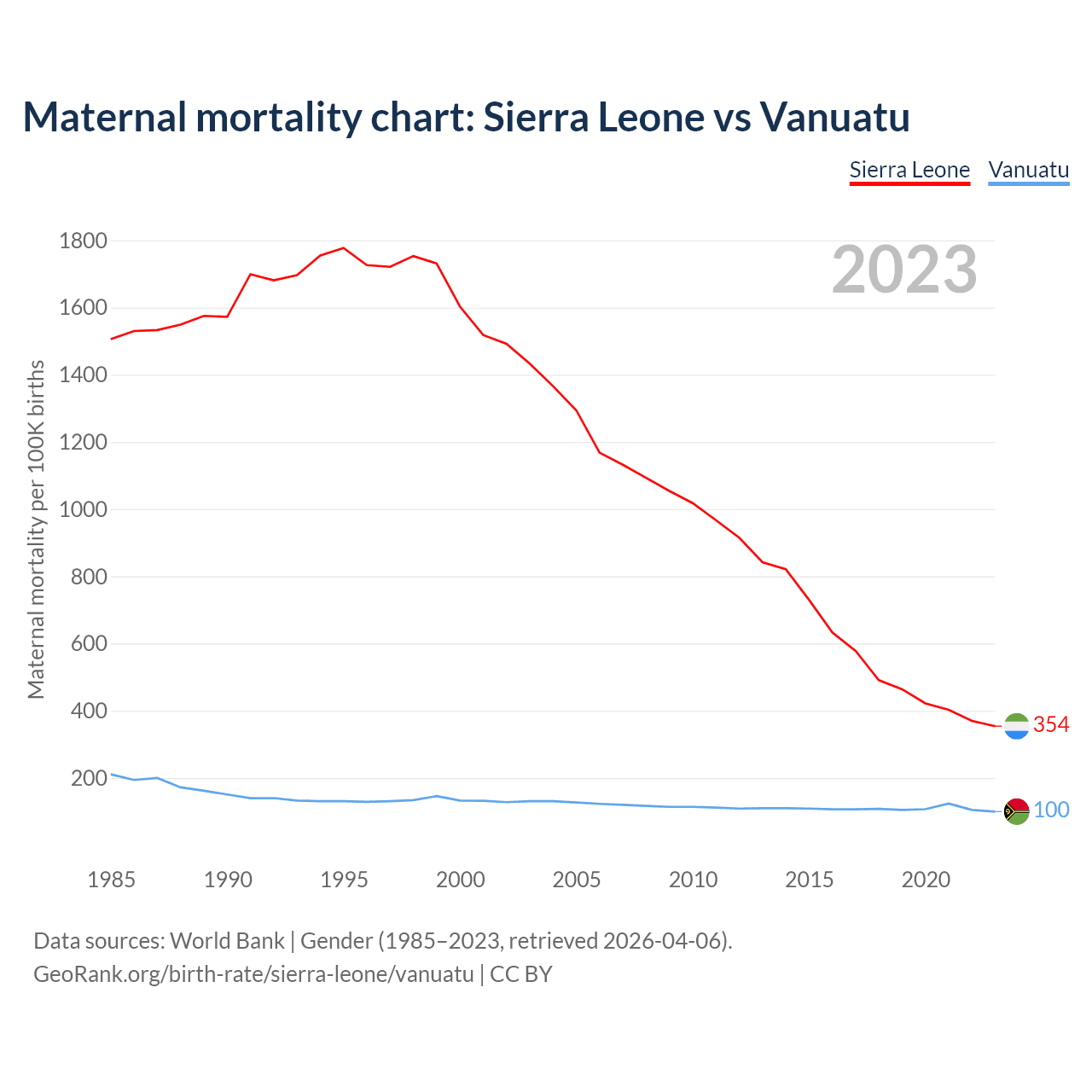 The maternal mortality rate, which is the probability of dying during childbirth or within 42 days of pregnancy termination, is 354 deaths per 100,000 live births in Sierra Leone, compared to 100 deaths in Vanuatu.