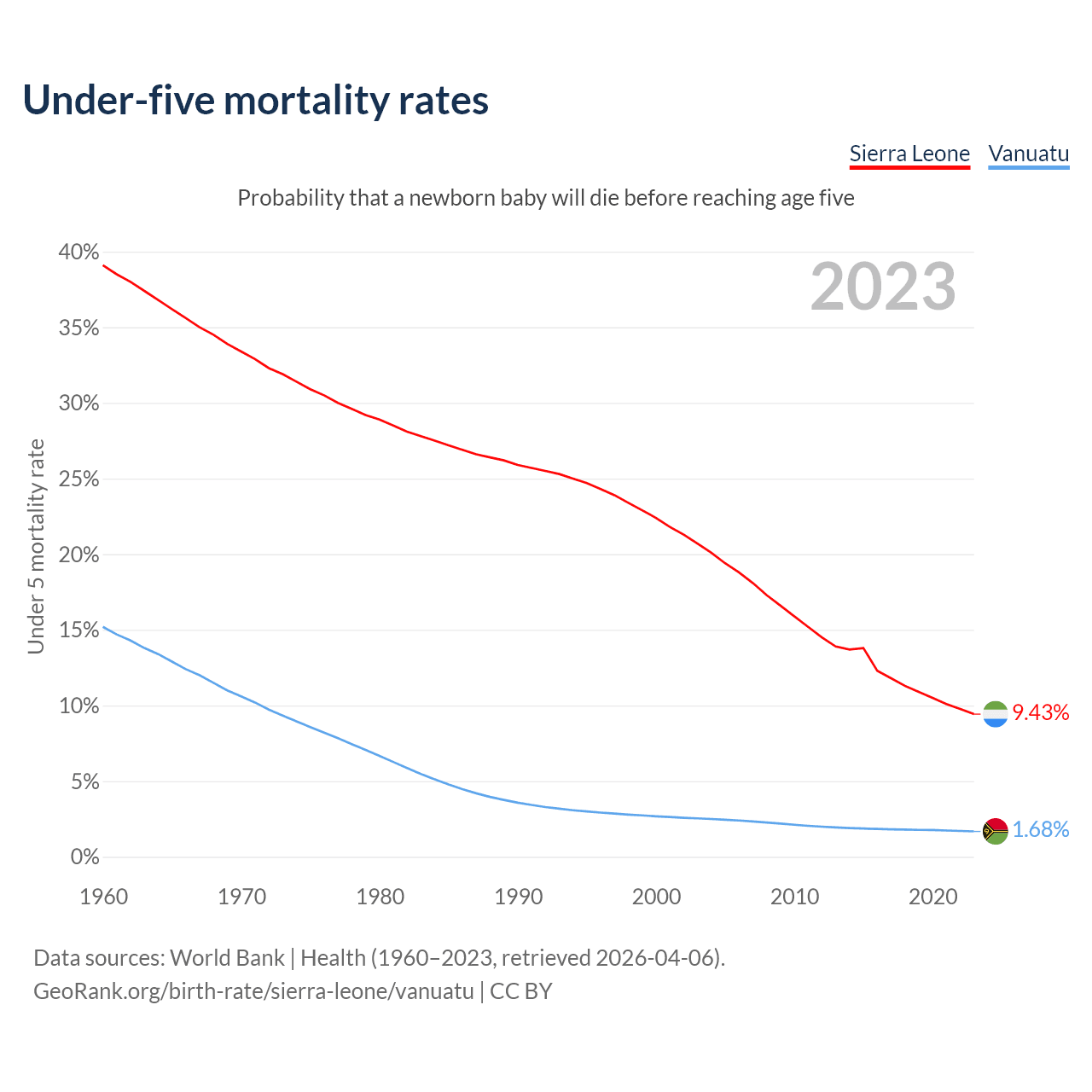 The chance that a newborn baby will die before reaching age five is 9.43% in Sierra Leone and 1.68% in Vanuatu. Above is a chart with historical data on under-five mortality rates.