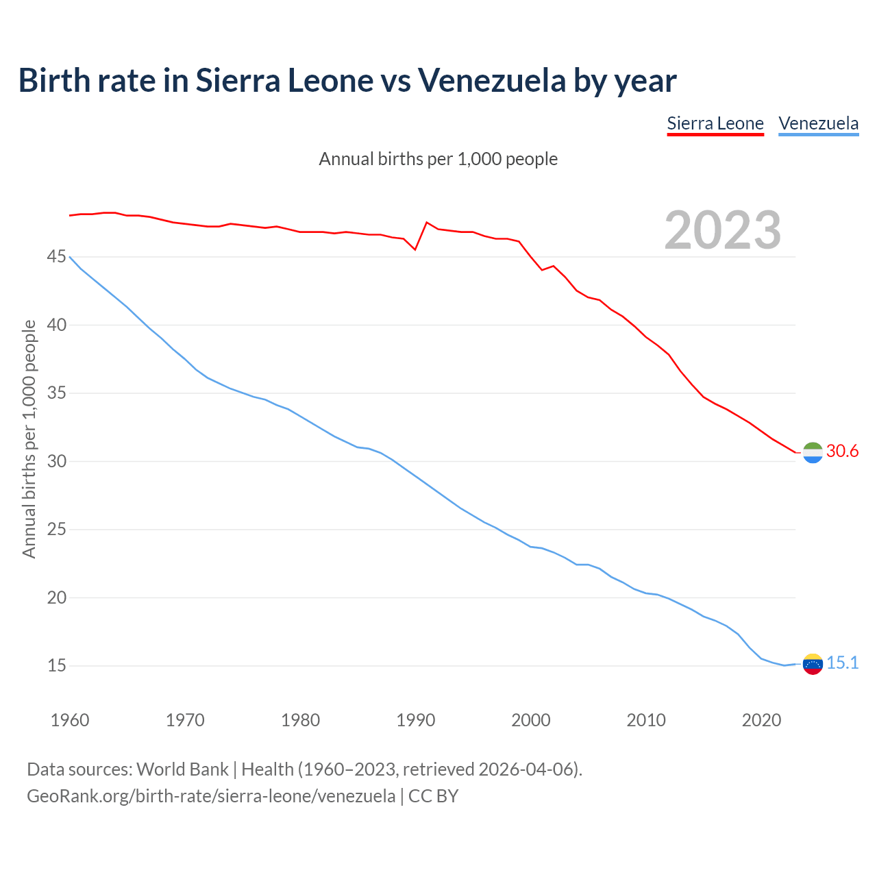 Sierra Leone has an annual birth rate of 30.6 births per 1,000 people, compared to 15.1 for Venezuela. The average number of children a woman is expected to have during her lifetime — the fertility rate, is 3.79 in Sierra Leone and 2.08 in Venezuela — 45.2% difference.