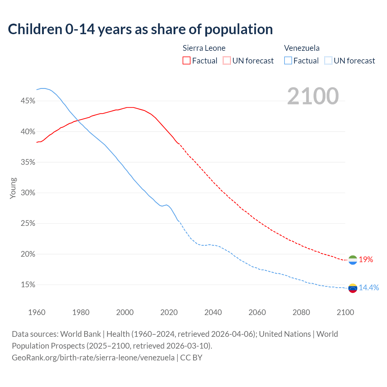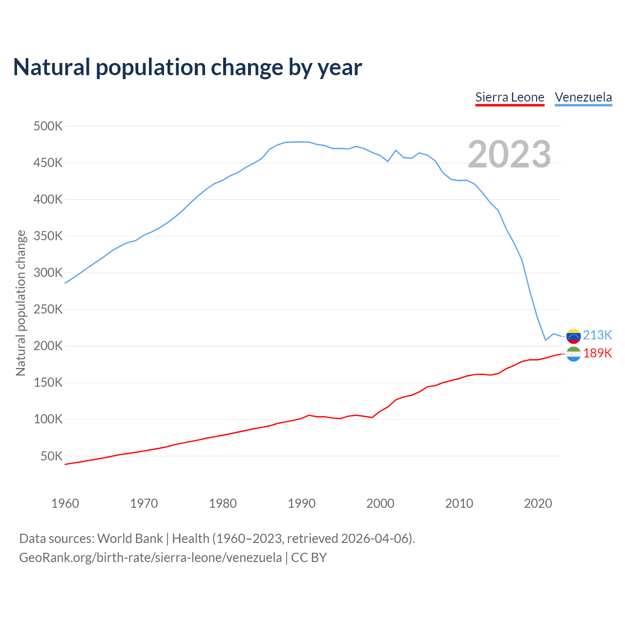 According to the latest available data on birth rates, the fertility rate in Sierra Leone was 3.79 children per woman in 2023, compared to 2.08 in Venezuela in 2023. The replacement level is considered to be 2.1 children per woman.