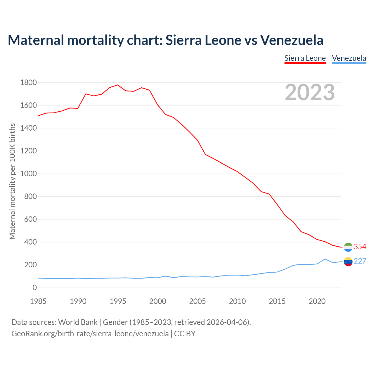 The maternal mortality rate, which is the probability of dying during childbirth or within 42 days of pregnancy termination, is 354 deaths per 100,000 live births in Sierra Leone, compared to 227 deaths in Venezuela.
