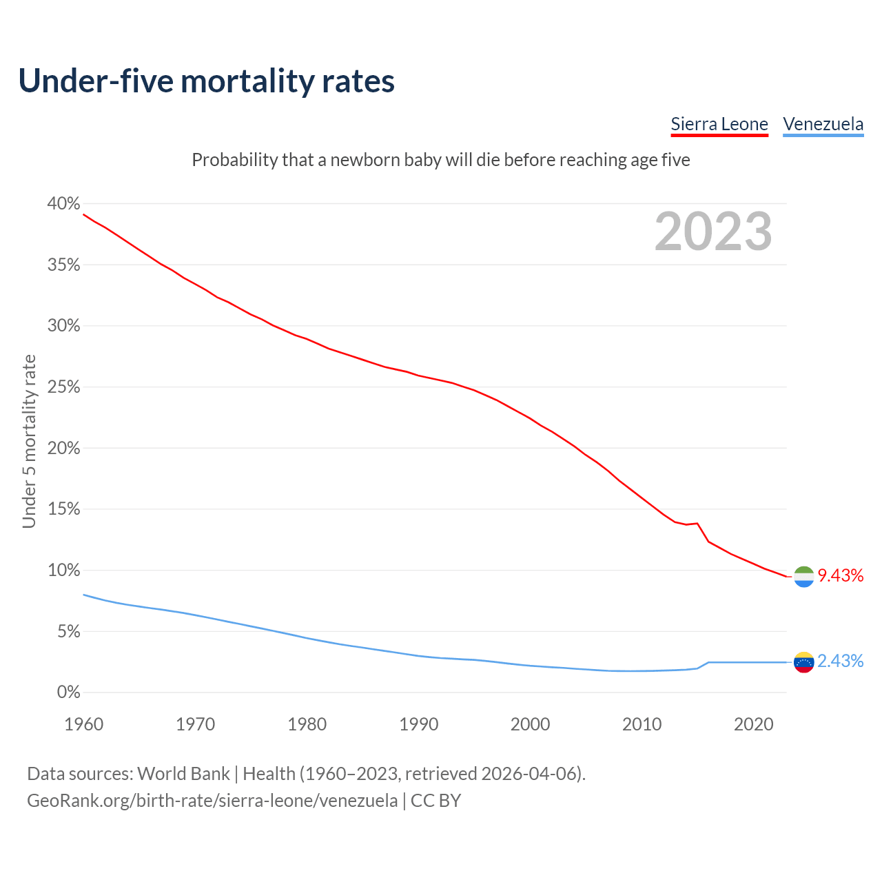 The chance that a newborn baby will die before reaching age five is 9.43% in Sierra Leone and 2.43% in Venezuela. Above is a chart with historical data on under-five mortality rates.