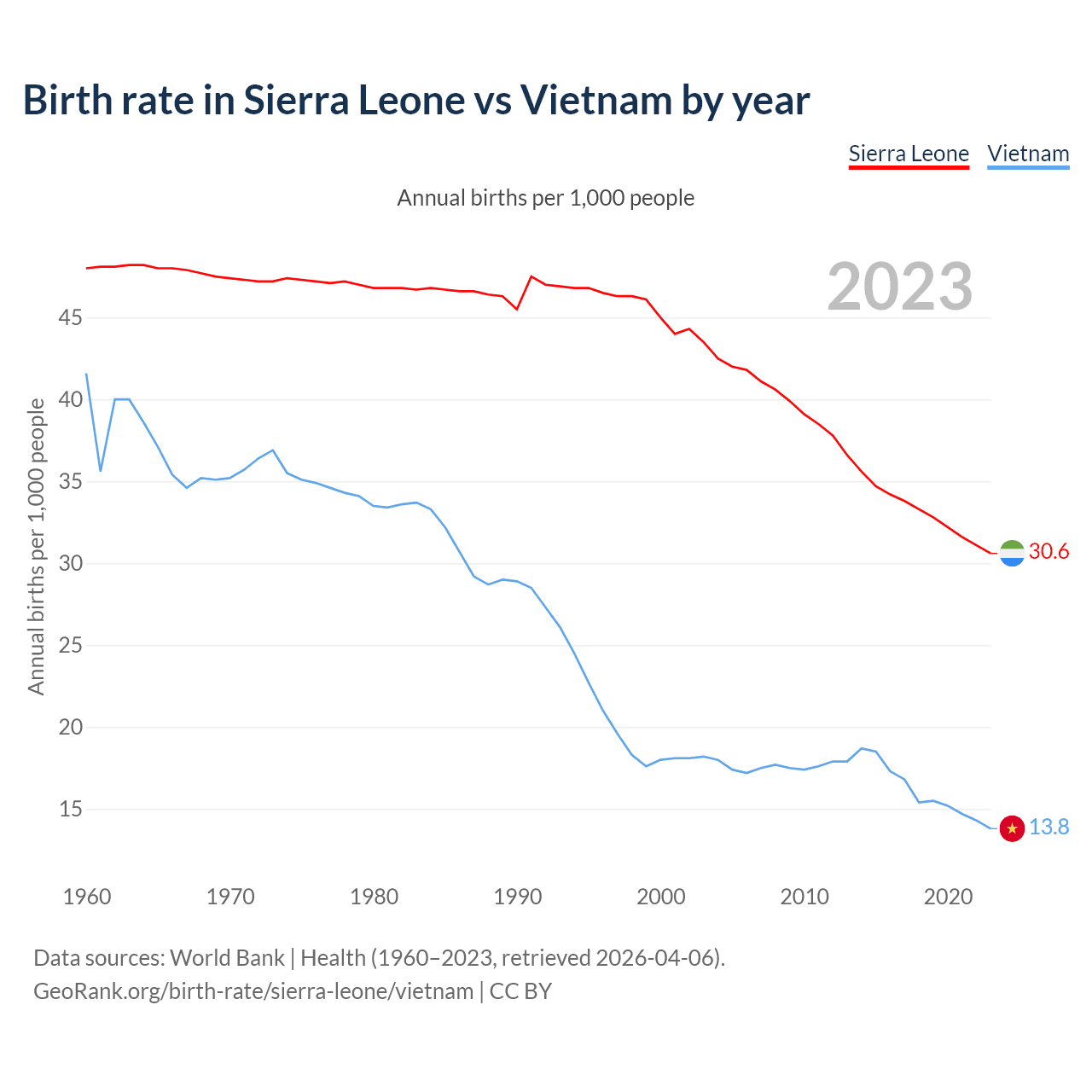Sierra Leone has an annual birth rate of 30.6 births per 1,000 people, compared to 13.8 for Vietnam. The average number of children a woman is expected to have during her lifetime — the fertility rate, is 3.79 in Sierra Leone and 1.91 in Vietnam — 49.5% difference.