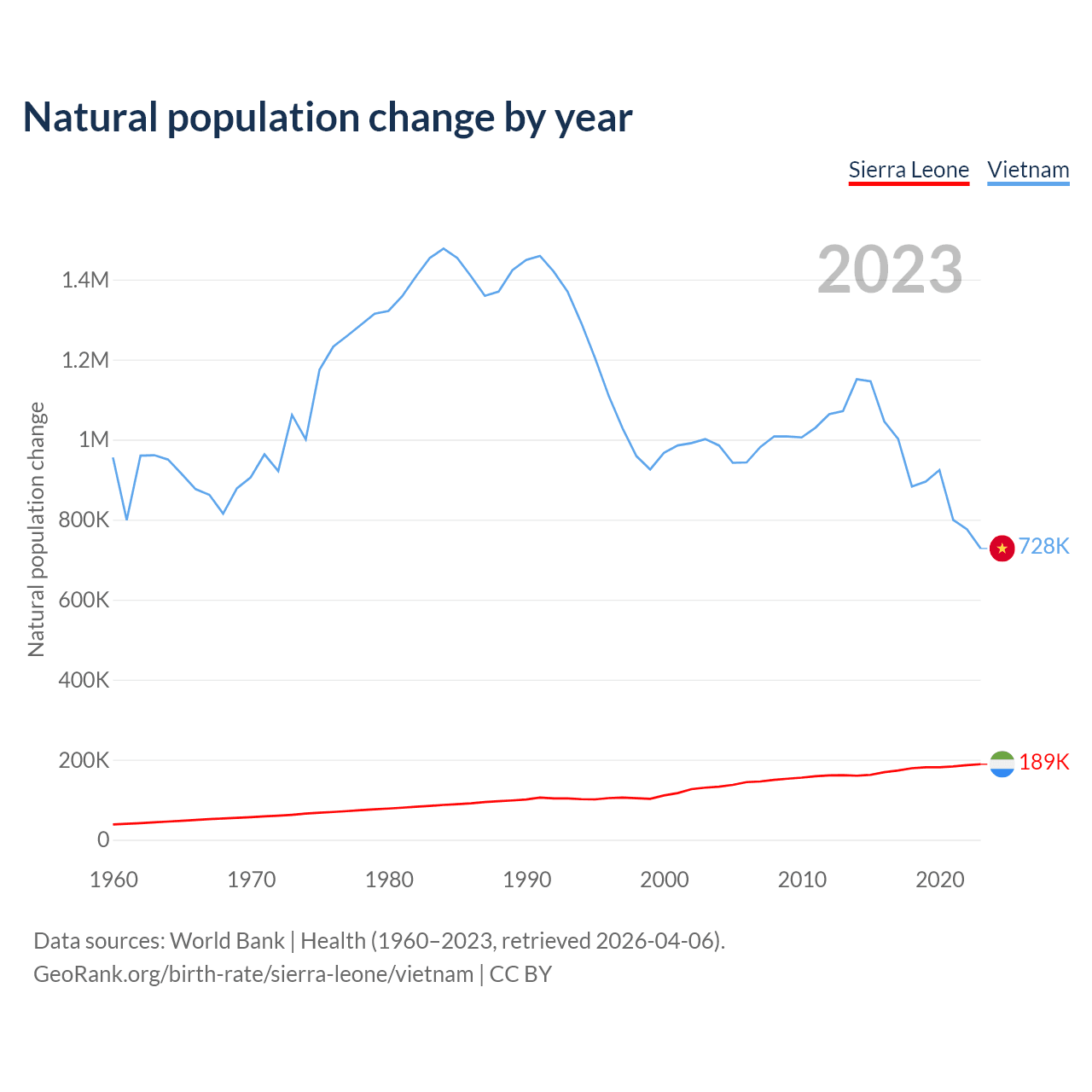 According to the latest available data on birth rates, the fertility rate in Sierra Leone was 3.79 children per woman in 2023, compared to 1.91 in Vietnam in 2023. The replacement level is considered to be 2.1 children per woman.