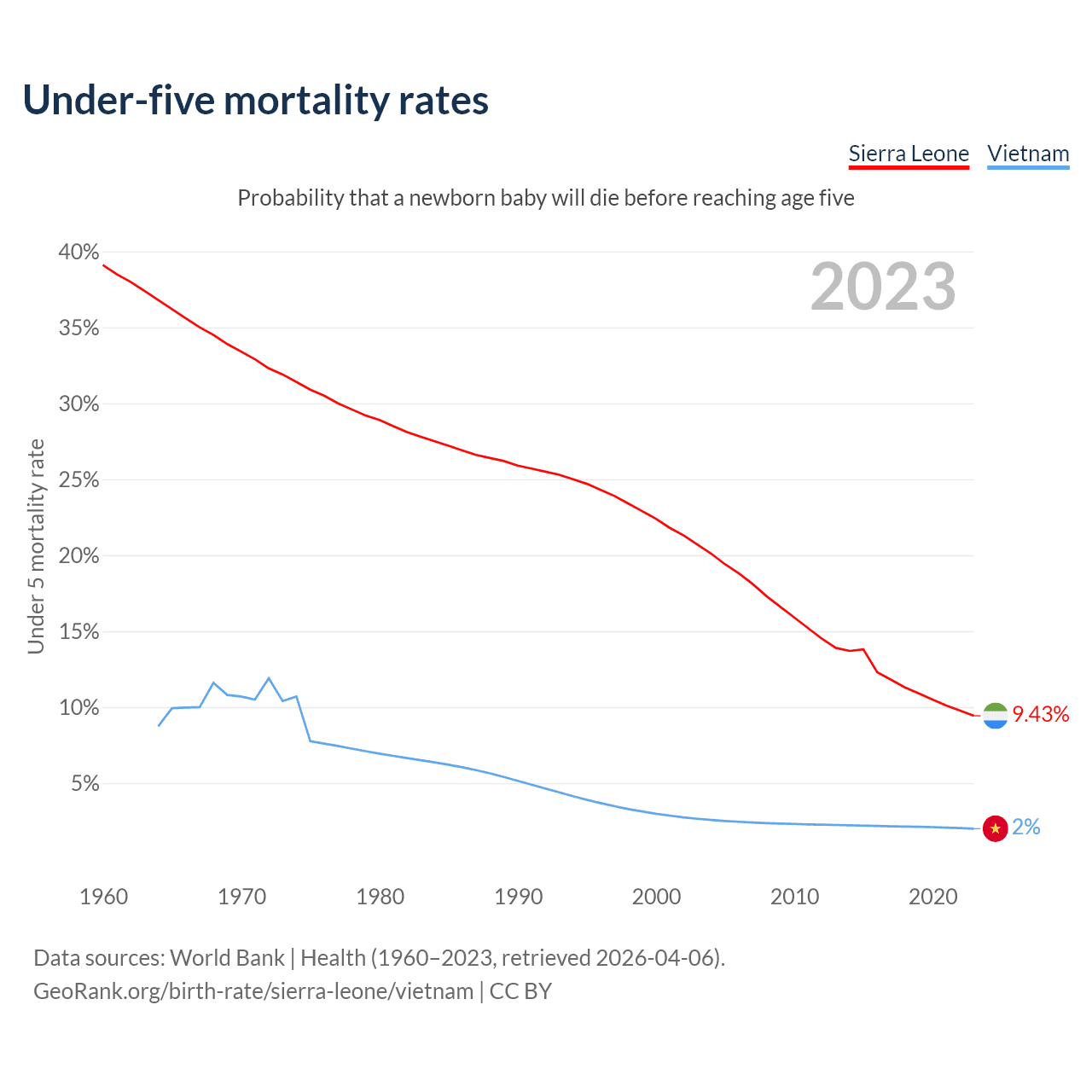 The chance that a newborn baby will die before reaching age five is 9.43% in Sierra Leone and 2% in Vietnam. Above is a chart with historical data on under-five mortality rates.