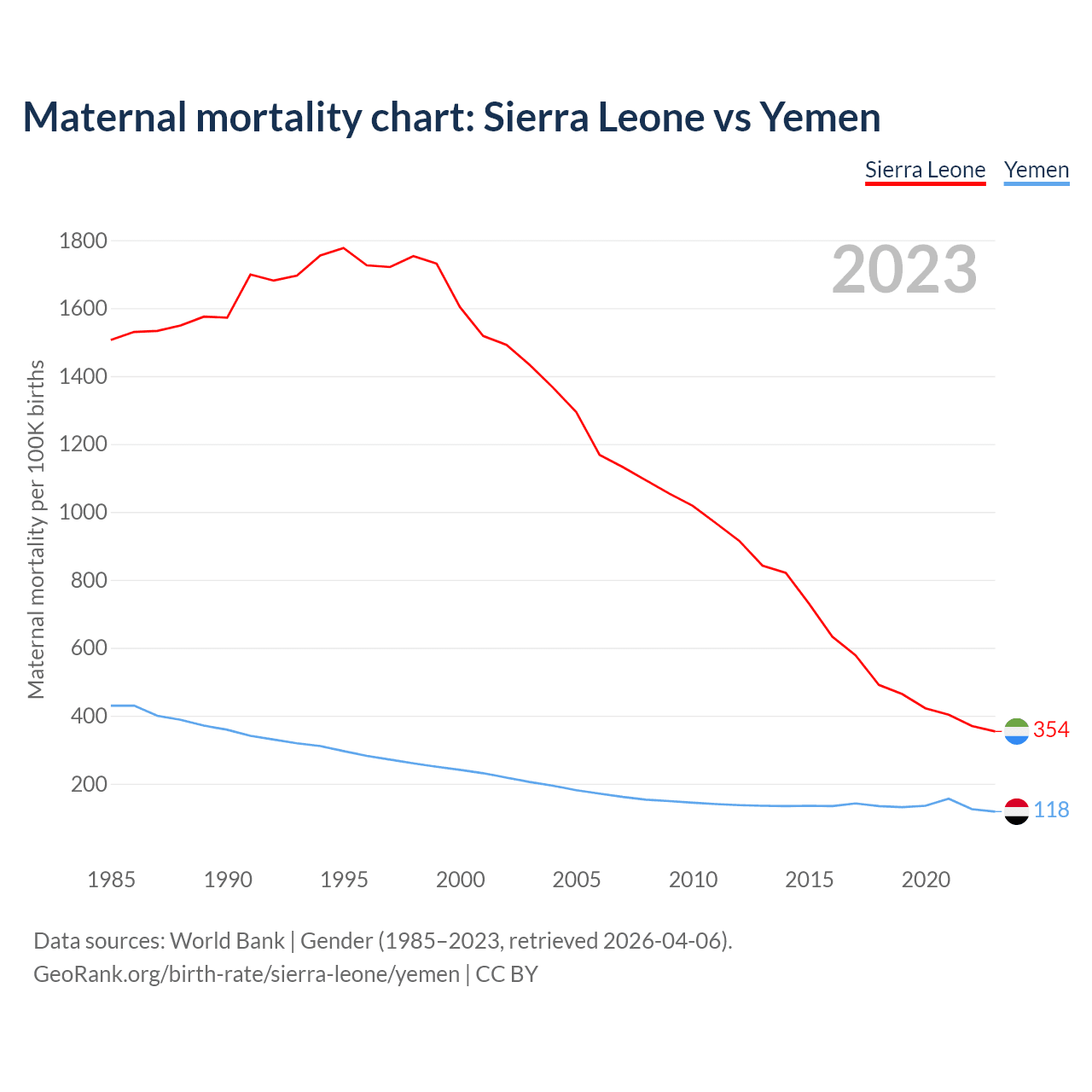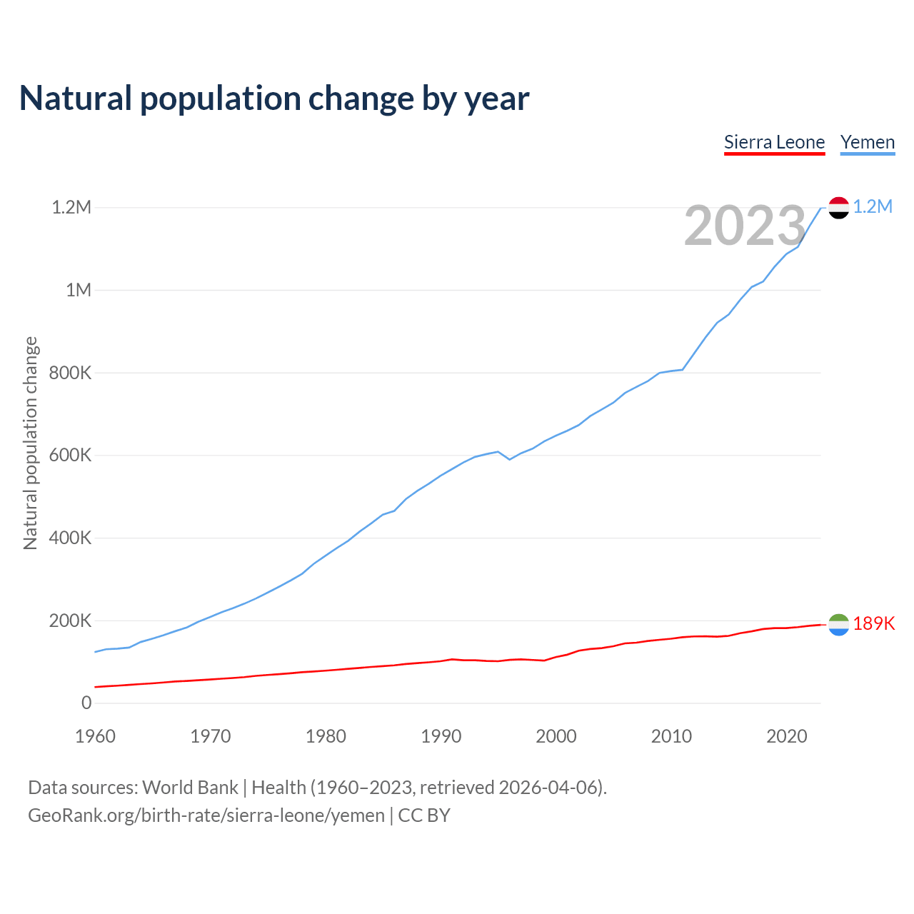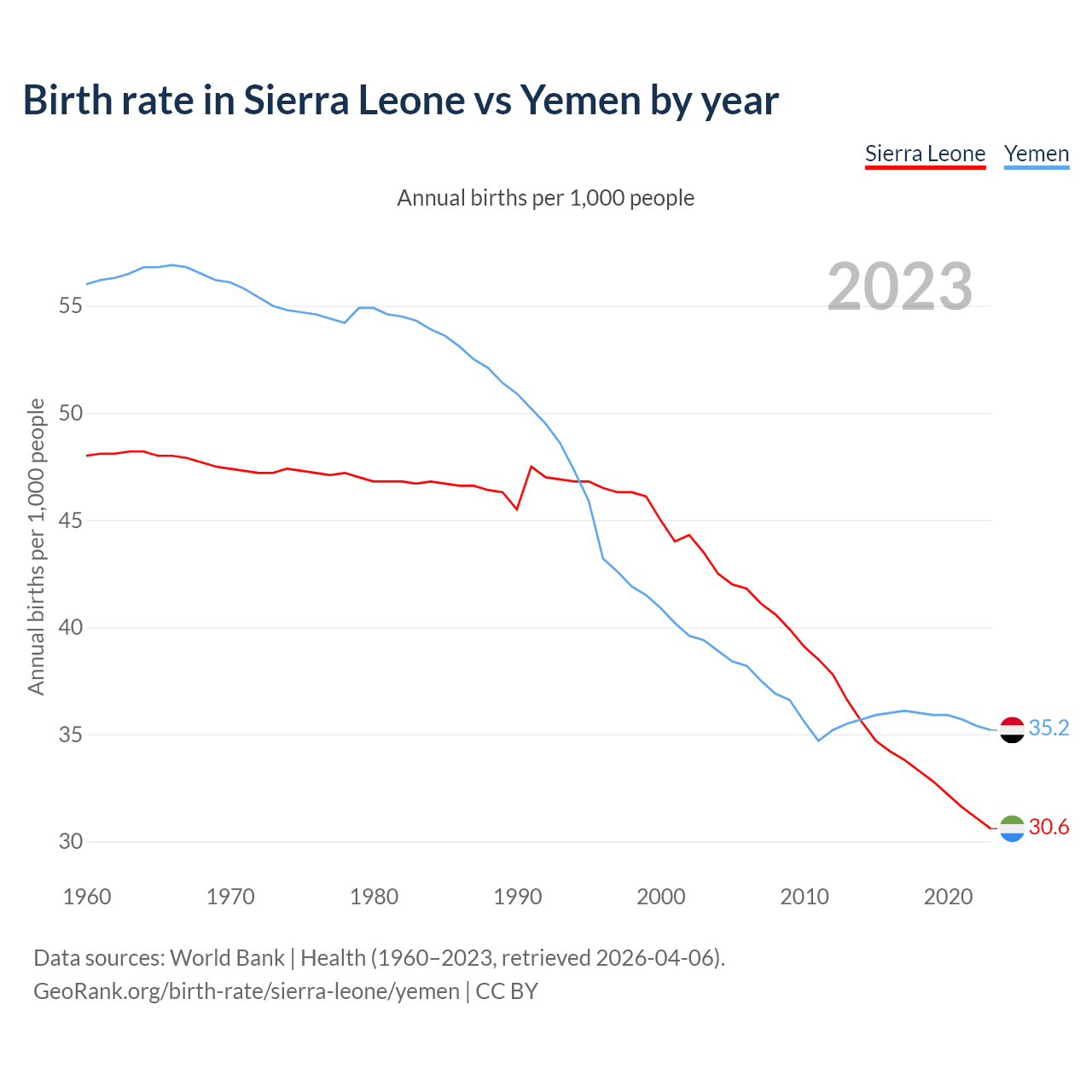 Sierra Leone has an annual birth rate of 30.6 births per 1,000 people, compared to 35.2 for Yemen. The average number of children a woman is expected to have during her lifetime — the fertility rate, is 3.79 in Sierra Leone and 4.59 in Yemen — 21.1% difference.