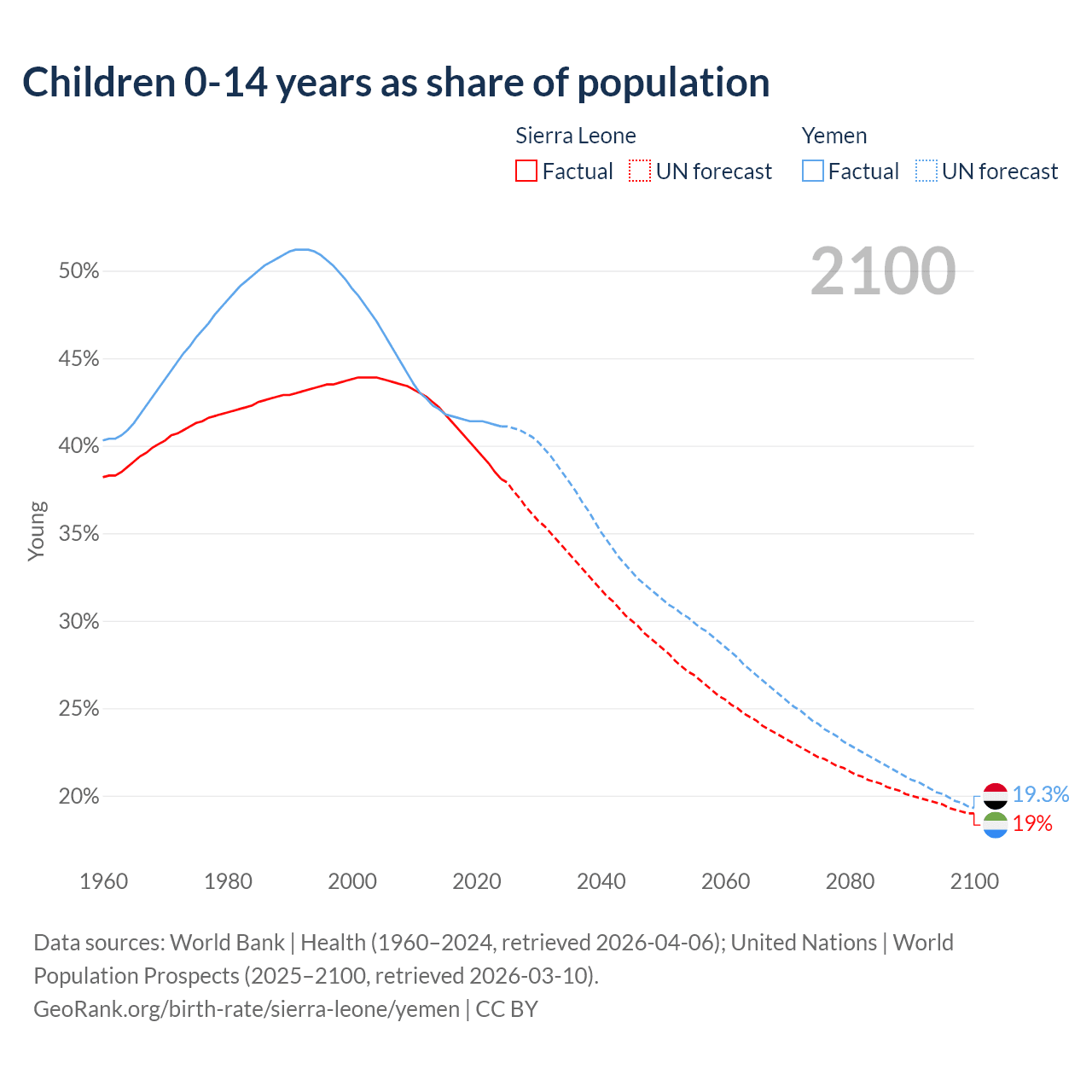 According to the latest available data on birth rates, the fertility rate in Sierra Leone was 3.79 children per woman in 2023, compared to 4.59 in Yemen in 2023. The replacement level is considered to be 2.1 children per woman.