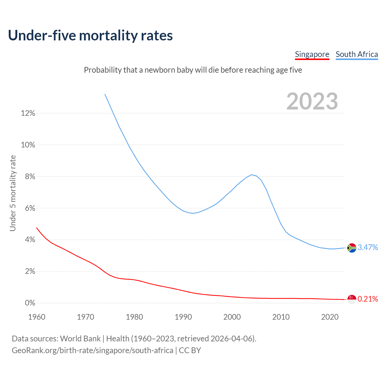 The chance that a newborn baby will die before reaching age five is 0.21% in Singapore and 3.47% in South Africa. Above is a chart with historical data on under-five mortality rates.
