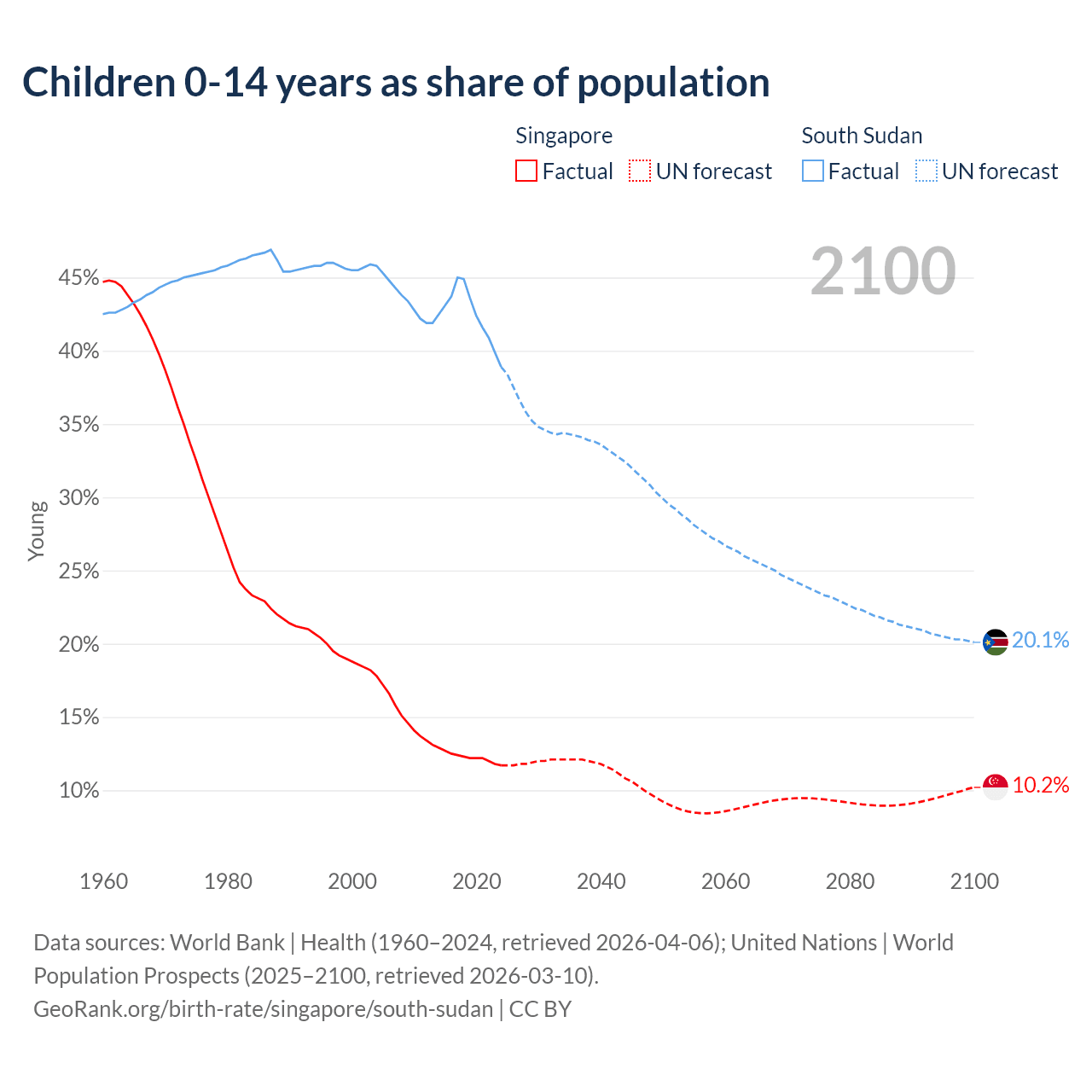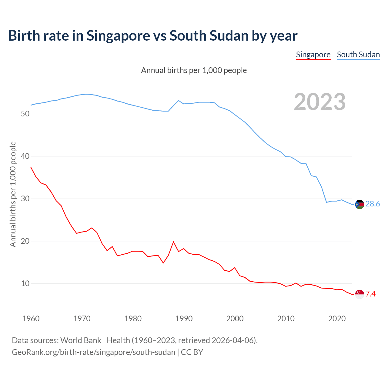 Singapore has an annual birth rate of 7.4 births per 1,000 people, compared to 28.6 for South Sudan. The average number of children a woman is expected to have during her lifetime — the fertility rate, is 0.97 in Singapore and 3.86 in South Sudan — 298.4% difference.
