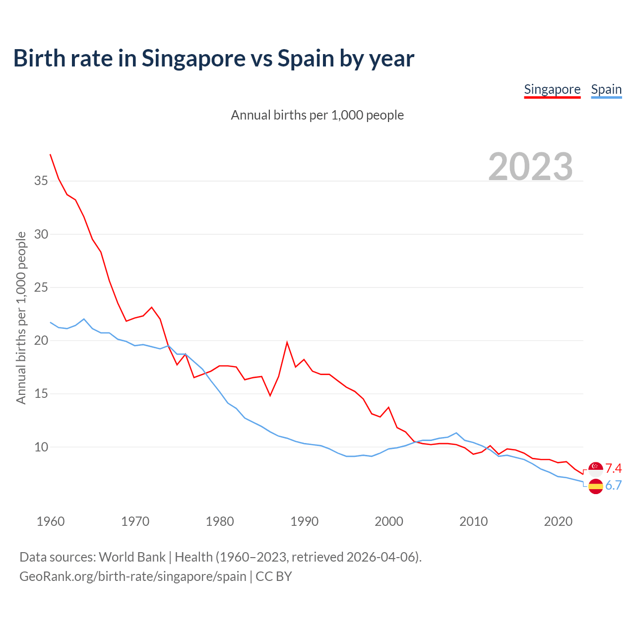 According to the latest available data on birth rates, the fertility rate in Singapore was 0.97 children per woman in 2023, compared to 1.12 in Spain in 2023. The replacement level is considered to be 2.1 children per woman.