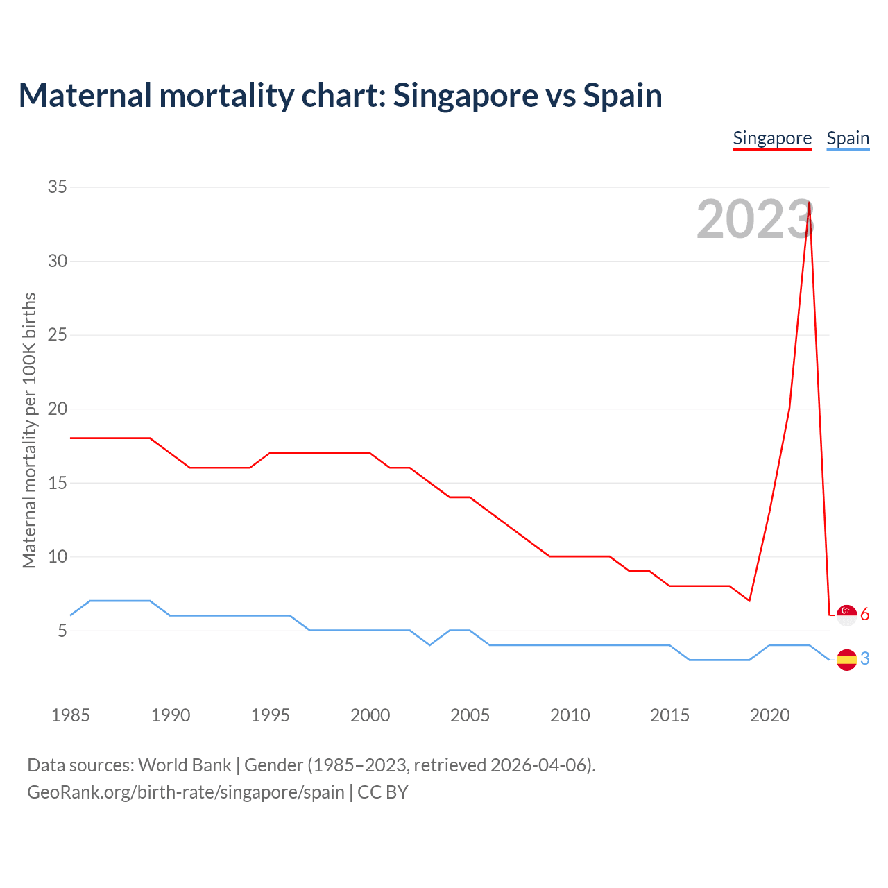 The maternal mortality rate, which is the probability of dying during childbirth or within 42 days of pregnancy termination, is 6 deaths per 100,000 live births in Singapore, compared to 3 deaths in Spain.