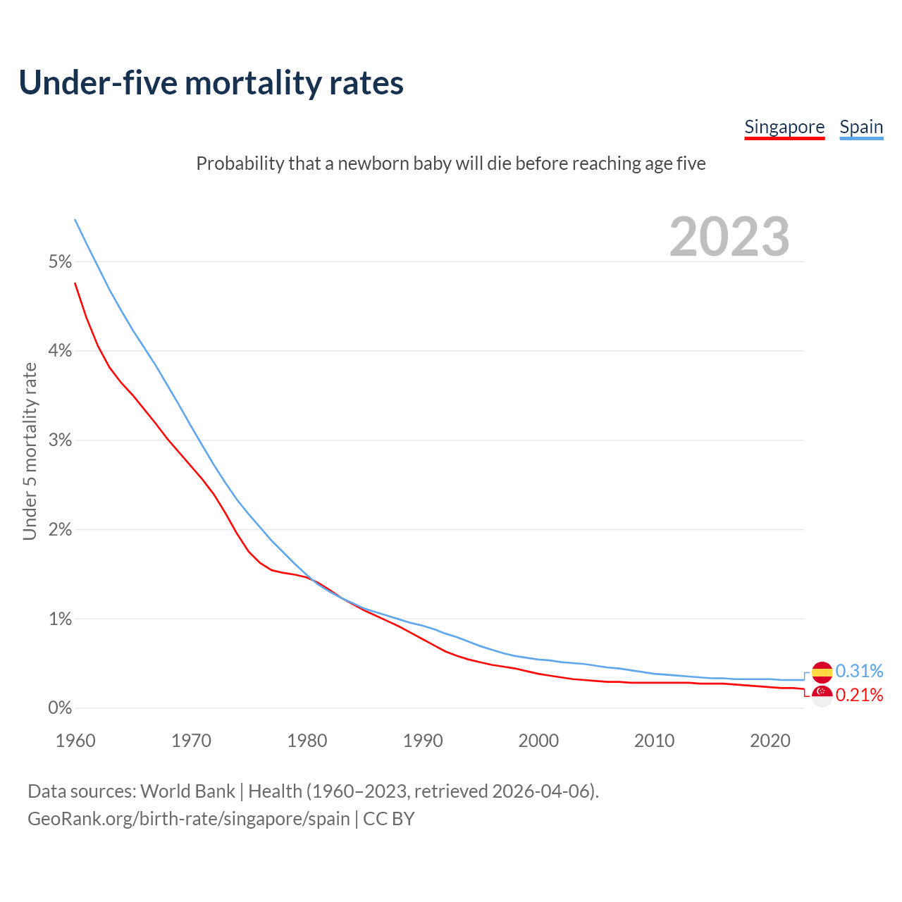 The chance that a newborn baby will die before reaching age five is 0.21% in Singapore and 0.31% in Spain. Above is a chart with historical data on under-five mortality rates.