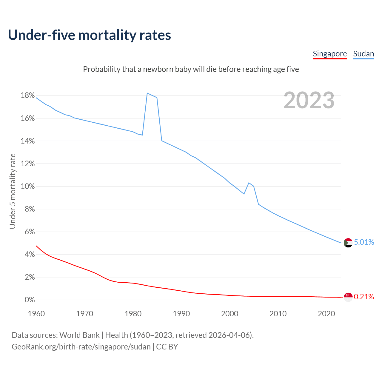 The chance that a newborn baby will die before reaching age five is 0.21% in Singapore and 5.01% in Sudan. Above is a chart with historical data on under-five mortality rates.