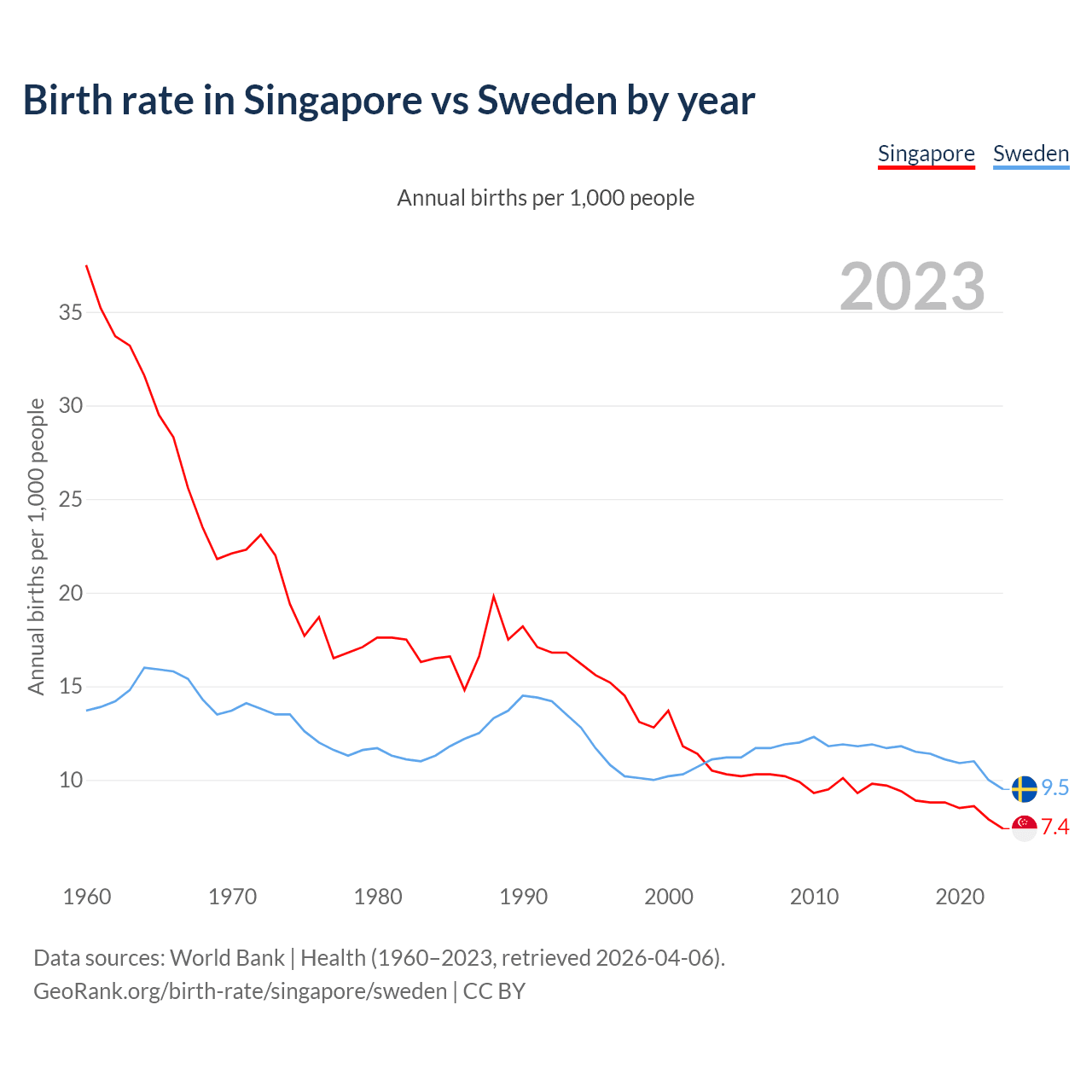 According to the latest available data on birth rates, the fertility rate in Singapore was 0.97 children per woman in 2023, compared to 1.45 in Sweden in 2023. The replacement level is considered to be 2.1 children per woman.