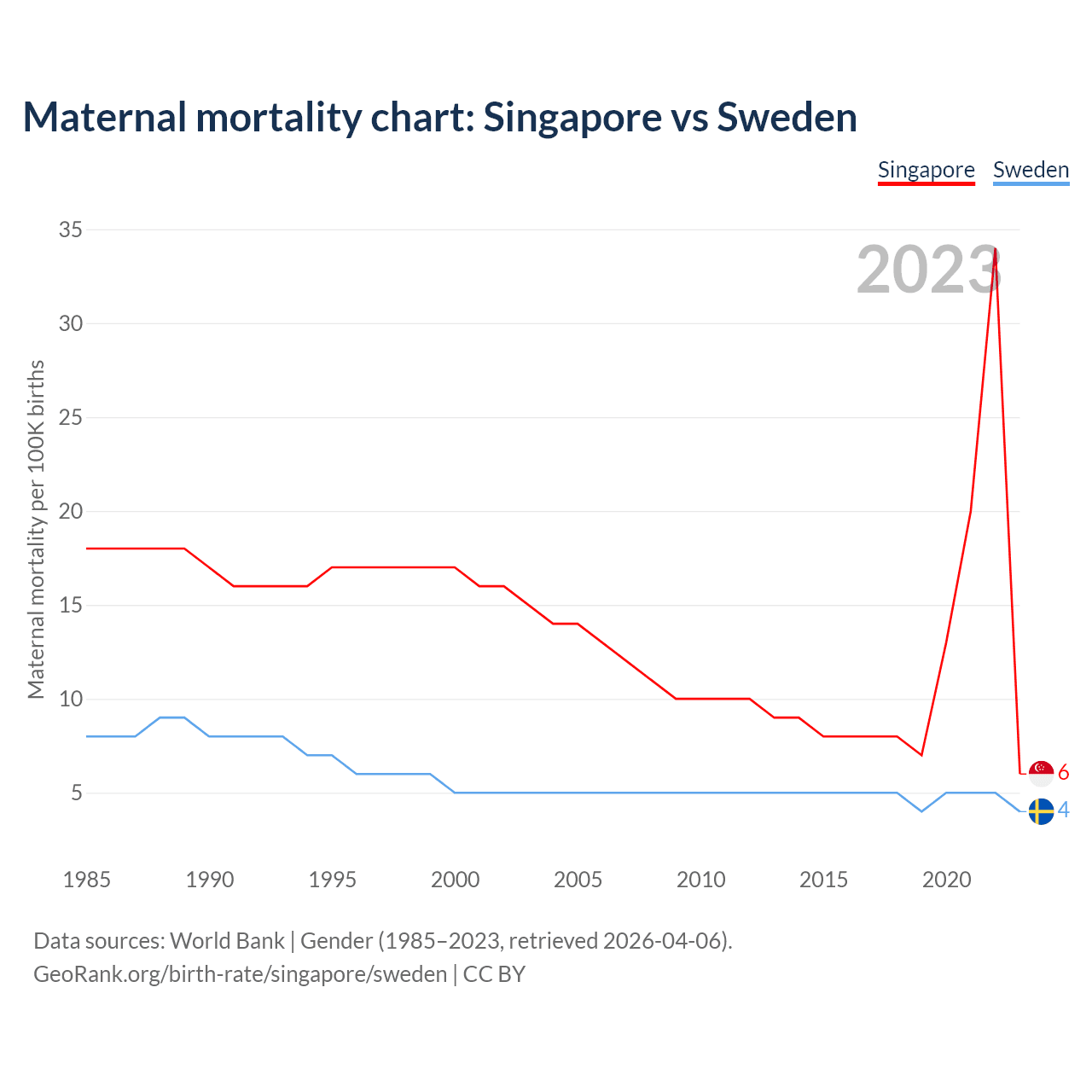 The maternal mortality rate, which is the probability of dying during childbirth or within 42 days of pregnancy termination, is 6 deaths per 100,000 live births in Singapore, compared to 4 deaths in Sweden.
