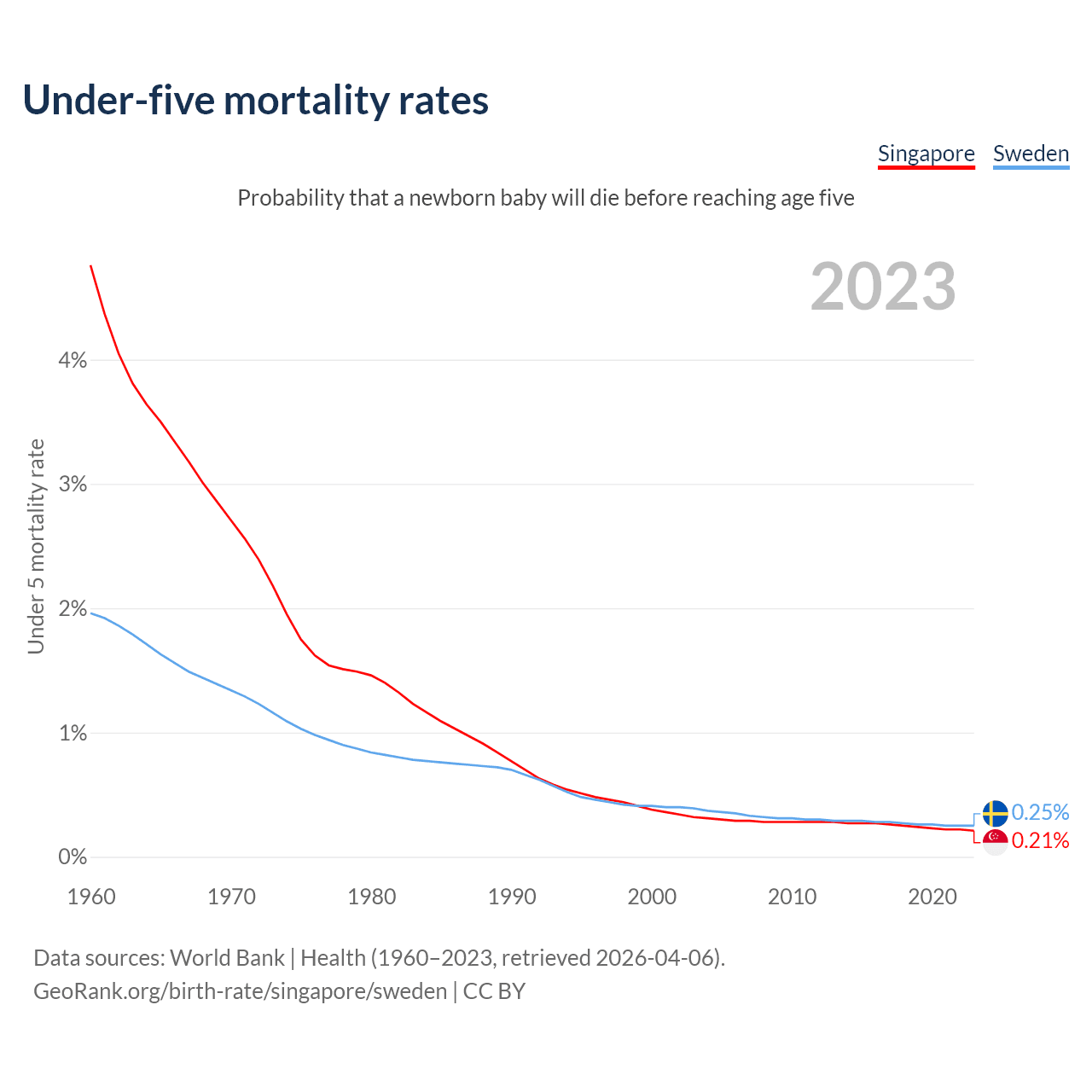 The chance that a newborn baby will die before reaching age five is 0.21% in Singapore and 0.25% in Sweden. Above is a chart with historical data on under-five mortality rates.