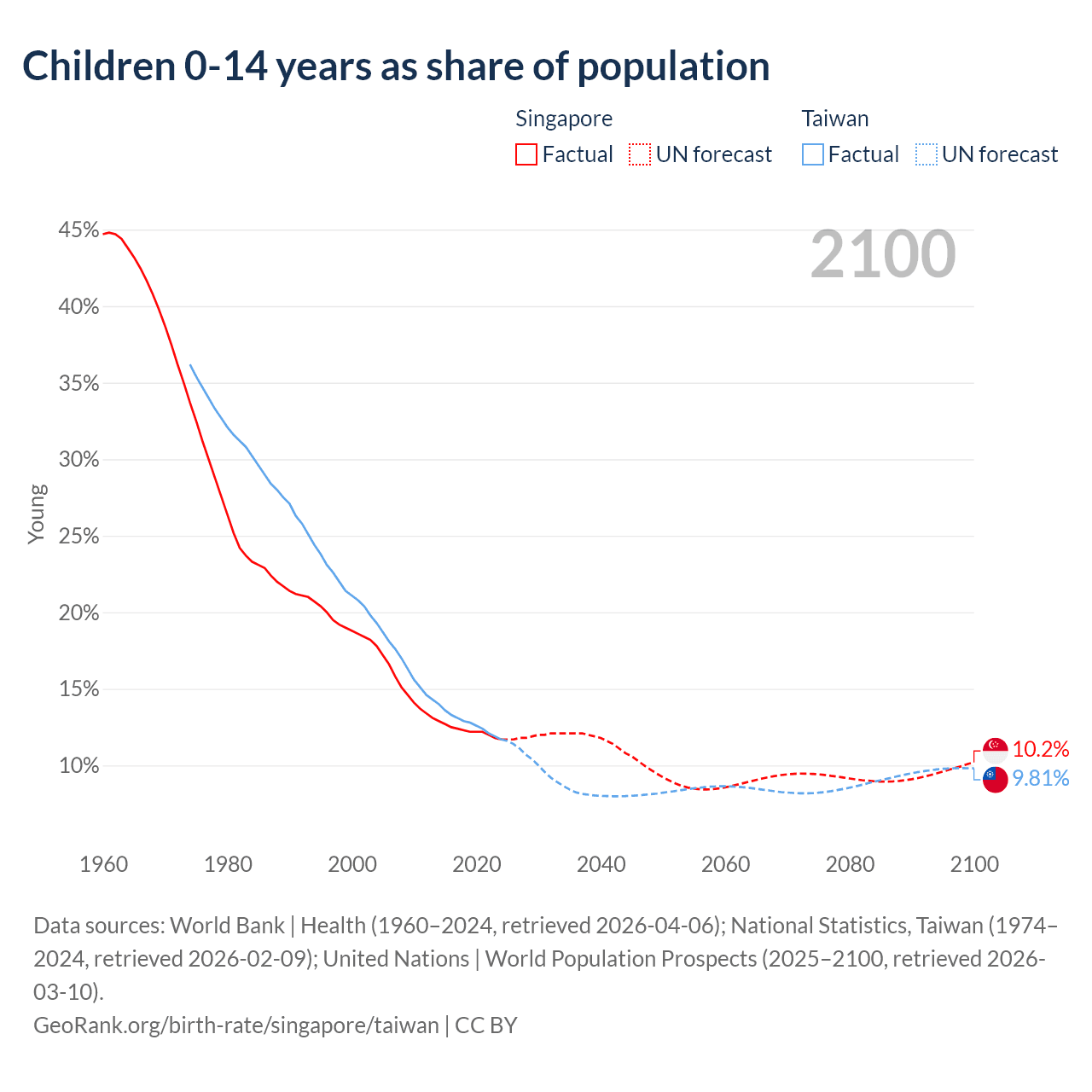 Data sources: World Bank | Health (1960–2024, retrieved 2026-04-06); National Statistics, Taiwan (1974–2024, retrieved 2026-02-09); United Nations | World Population Prospects (2025–2100, retrieved 2026-03-10).