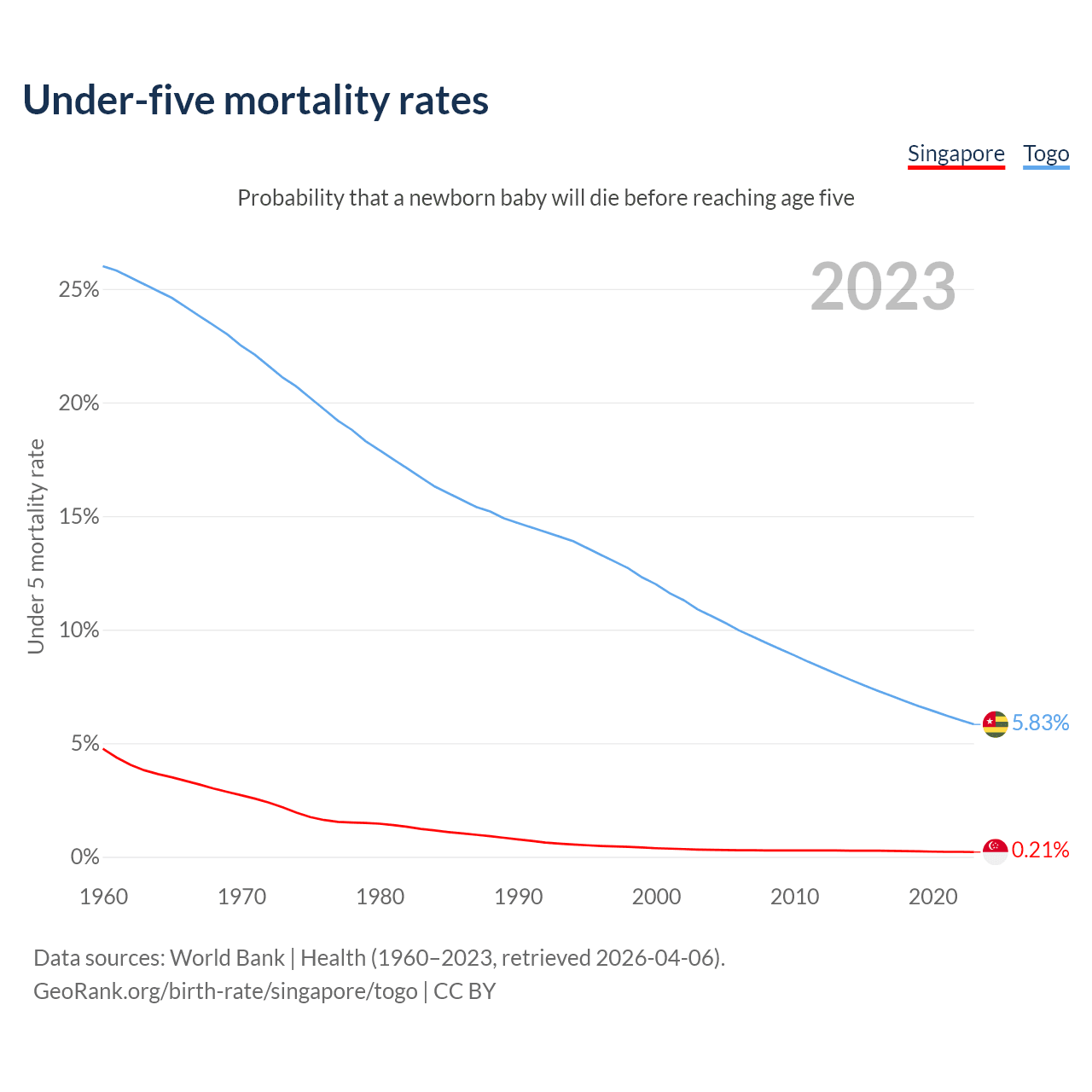 The chance that a newborn baby will die before reaching age five is 0.21% in Singapore and 5.83% in Togo. Above is a chart with historical data on under-five mortality rates.
