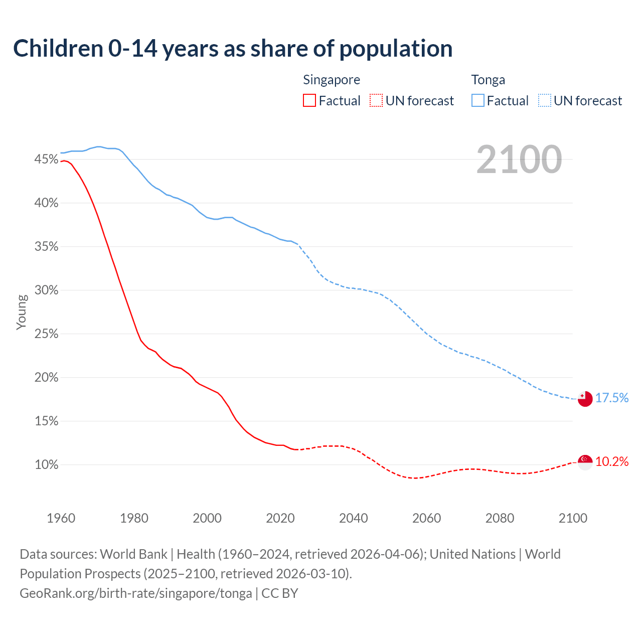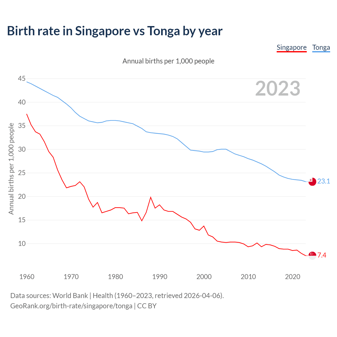 Singapore has an annual birth rate of 7.4 births per 1,000 people, compared to 23.1 for Tonga. The average number of children a woman is expected to have during her lifetime — the fertility rate, is 0.97 in Singapore and 3.13 in Tonga — 222.6% difference.