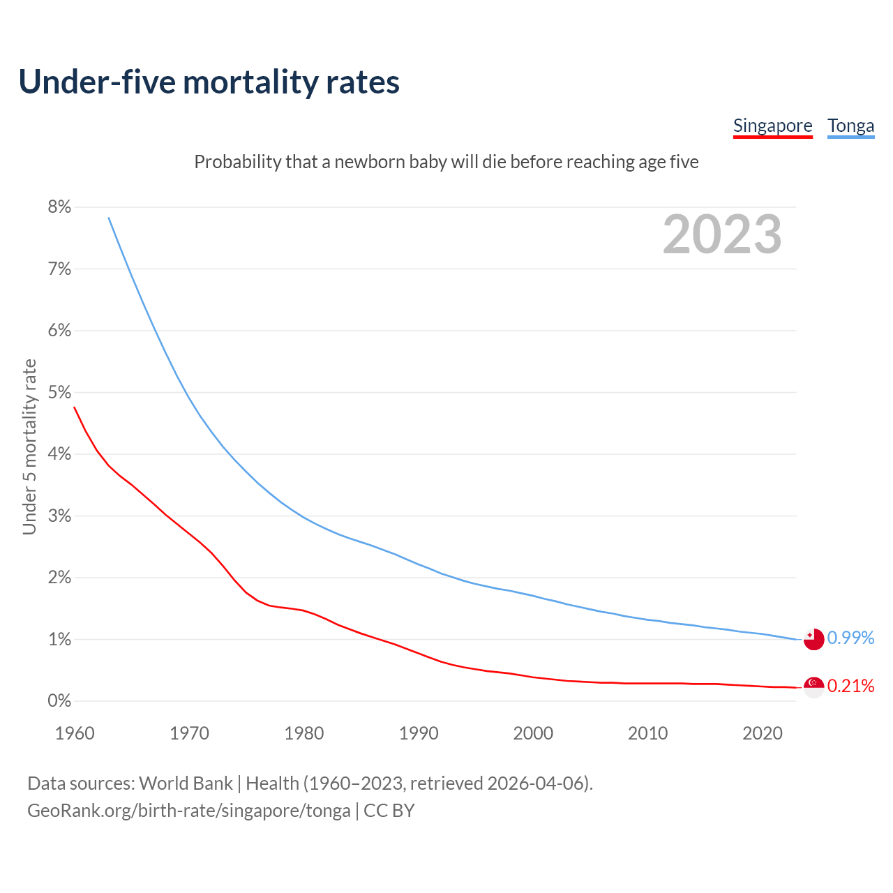 The chance that a newborn baby will die before reaching age five is 0.21% in Singapore and 0.99% in Tonga. Above is a chart with historical data on under-five mortality rates.