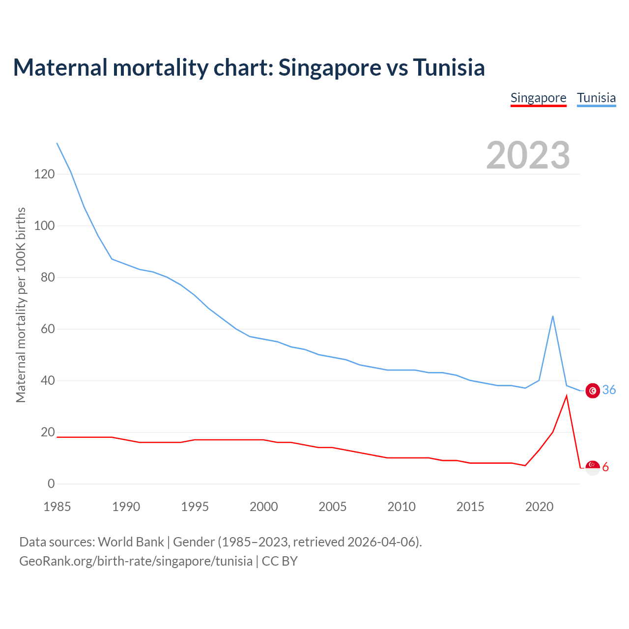 The maternal mortality rate, which is the probability of dying during childbirth or within 42 days of pregnancy termination, is 6 deaths per 100,000 live births in Singapore, compared to 36 deaths in Tunisia.